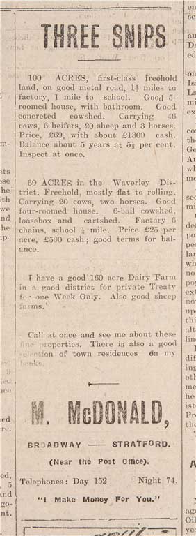 Mick is married in 1910 and purchased a farm on the outskirts of Stratford. He began negotiating livestock and butterfat sales.