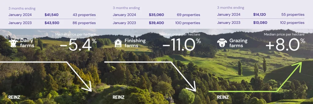 The median price per hectare for all farms sold in the three months to January 2024 was $30,940, down from $32,895 recorded for the three months ended January 2023 (-5.9%). The median price per hectare fell 8.9% from December 2023.