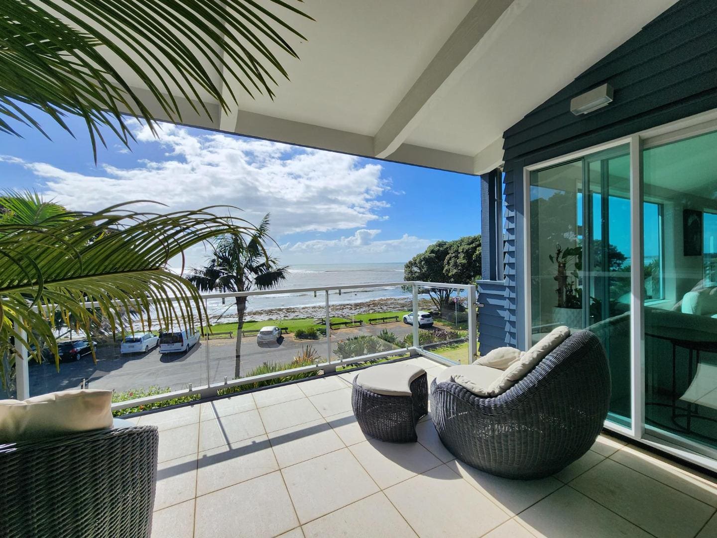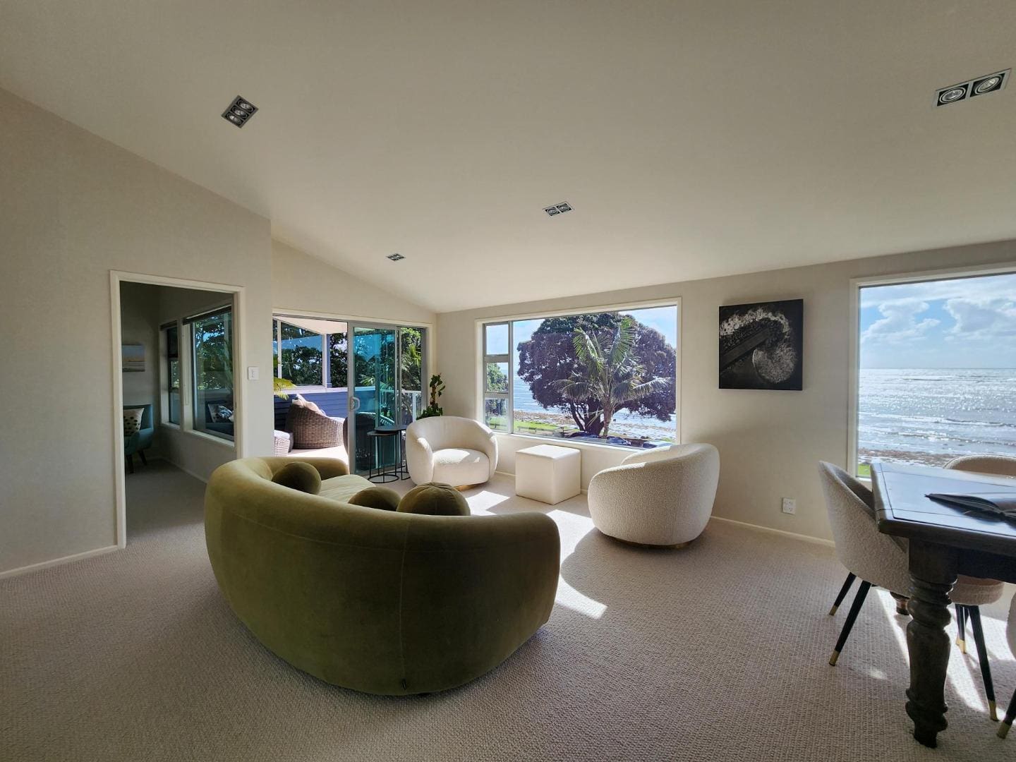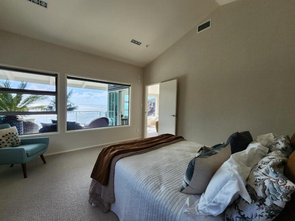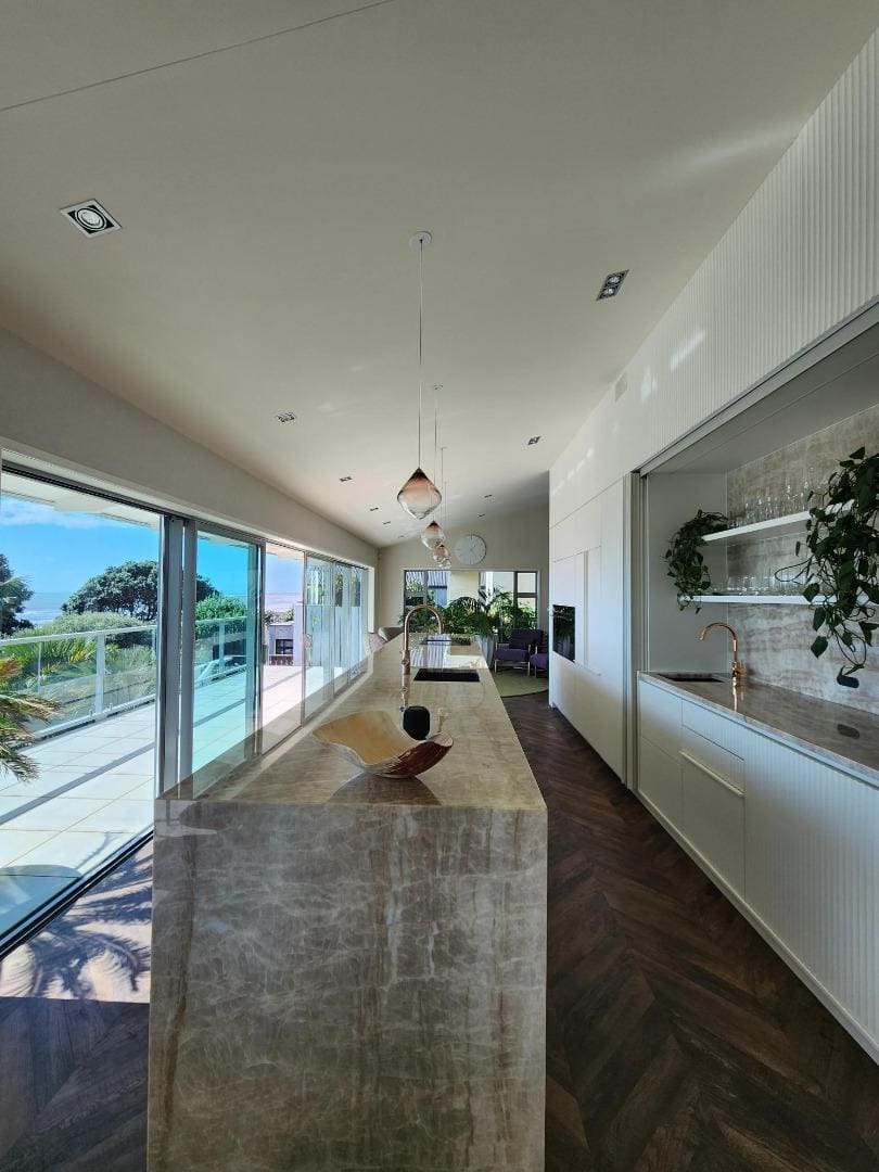 Blending tranquility with elegance, this residence is the perfect sanctuary. Expansive open-plan living areas flow effortlessly to multiple outdoor patios–ideal for relaxing, entertaining, and soaking in the breathtaking vistas. The flat lawn leads directly down to the beach, making it a true coastal haven.