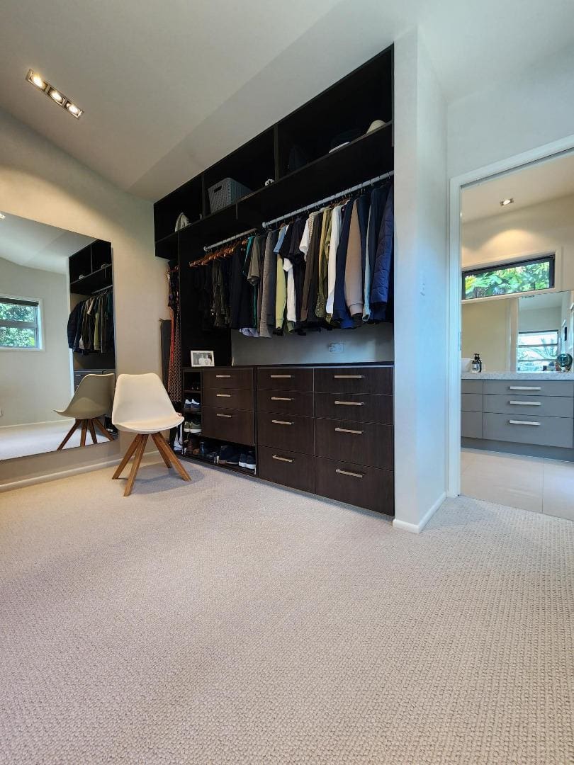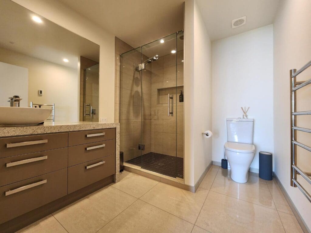 This level features two generous bedrooms, including the master suite complete with a spacious walk-in robe, spacious ensuite, and private spa access–your own personal retreat. office and storage are all hidden behind doors in the main living area. A family bathroom with bath and shower, separate toilet, and a double garage with internal access, laundry, and great storage completes this level.