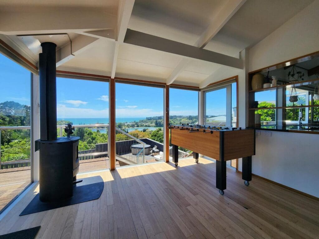 -spacious modern open-plan kitchen and dining area, a true highlight, flowing seamlessly outdoors to a large sun-soaked deck complete with a bar leaner in kitchen — perfect for entertaining or enjoying relaxed family gatherings while overlooking Urenui Beach and the pool below.
