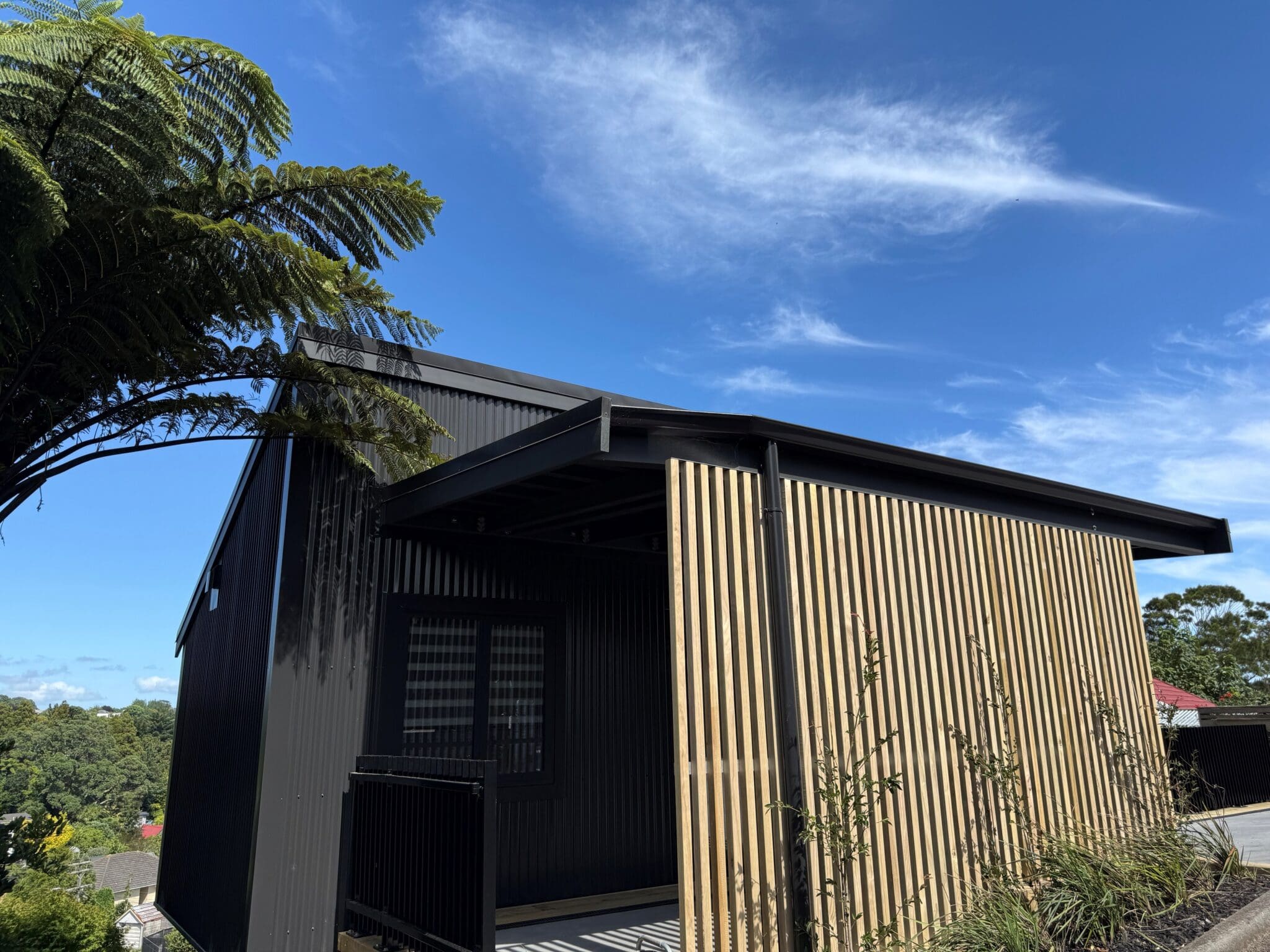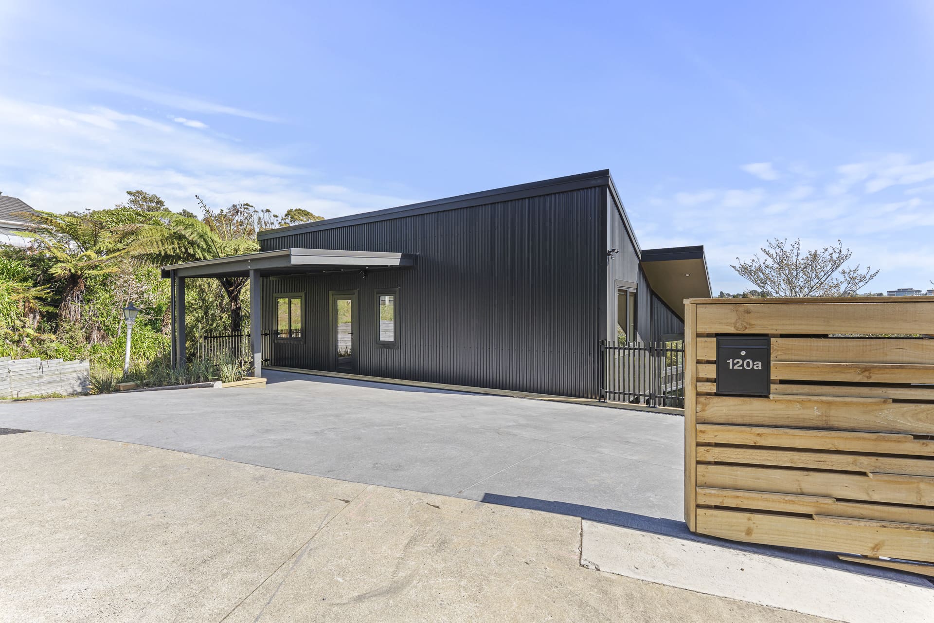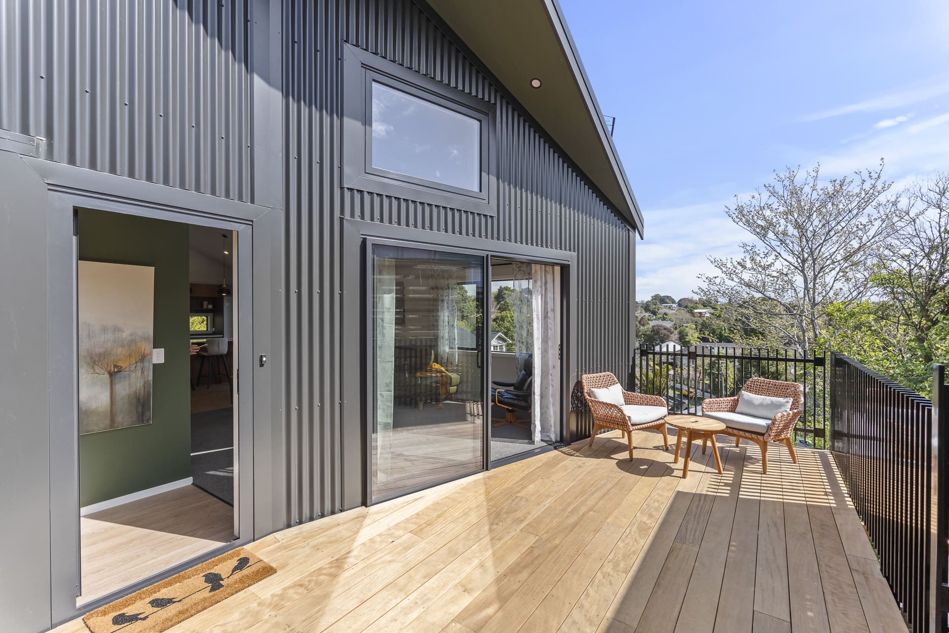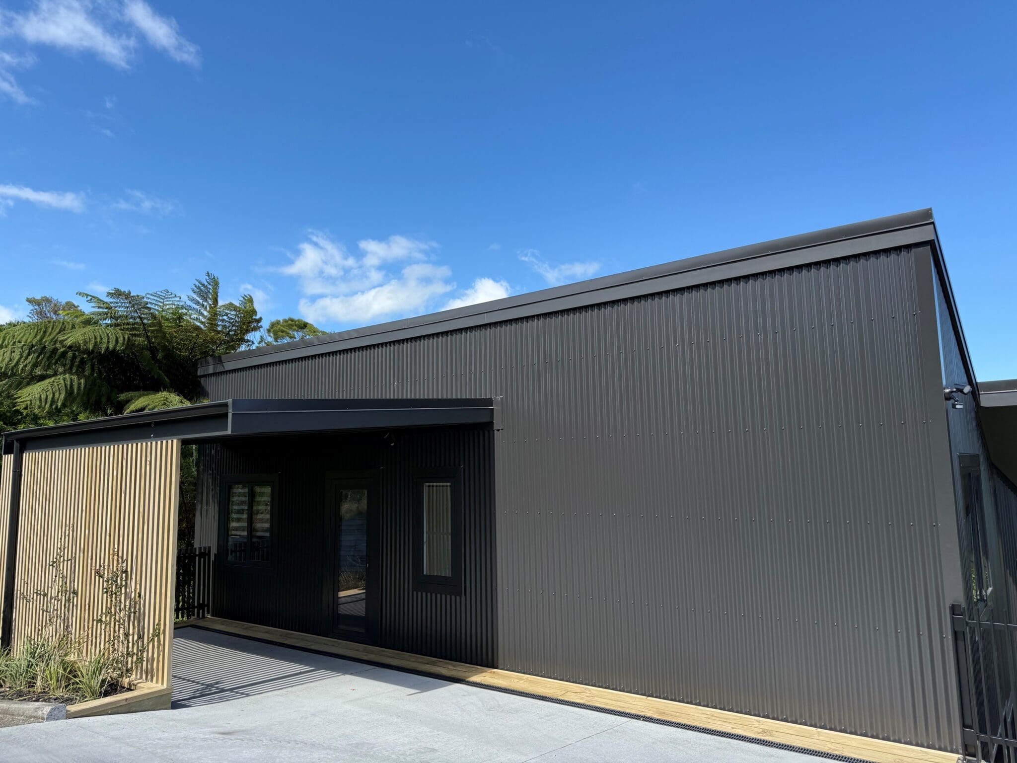 Clad in striking corrugated colorsteel, the exterior hints at the thoughtful design within. Step inside to soaring stud heights, beautiful timber features, and an airy, open-plan layout. The designer kitchen is a standout – featuring engineered stone benchtops and premium appliances, ideal for entertainers and everyday living alike.