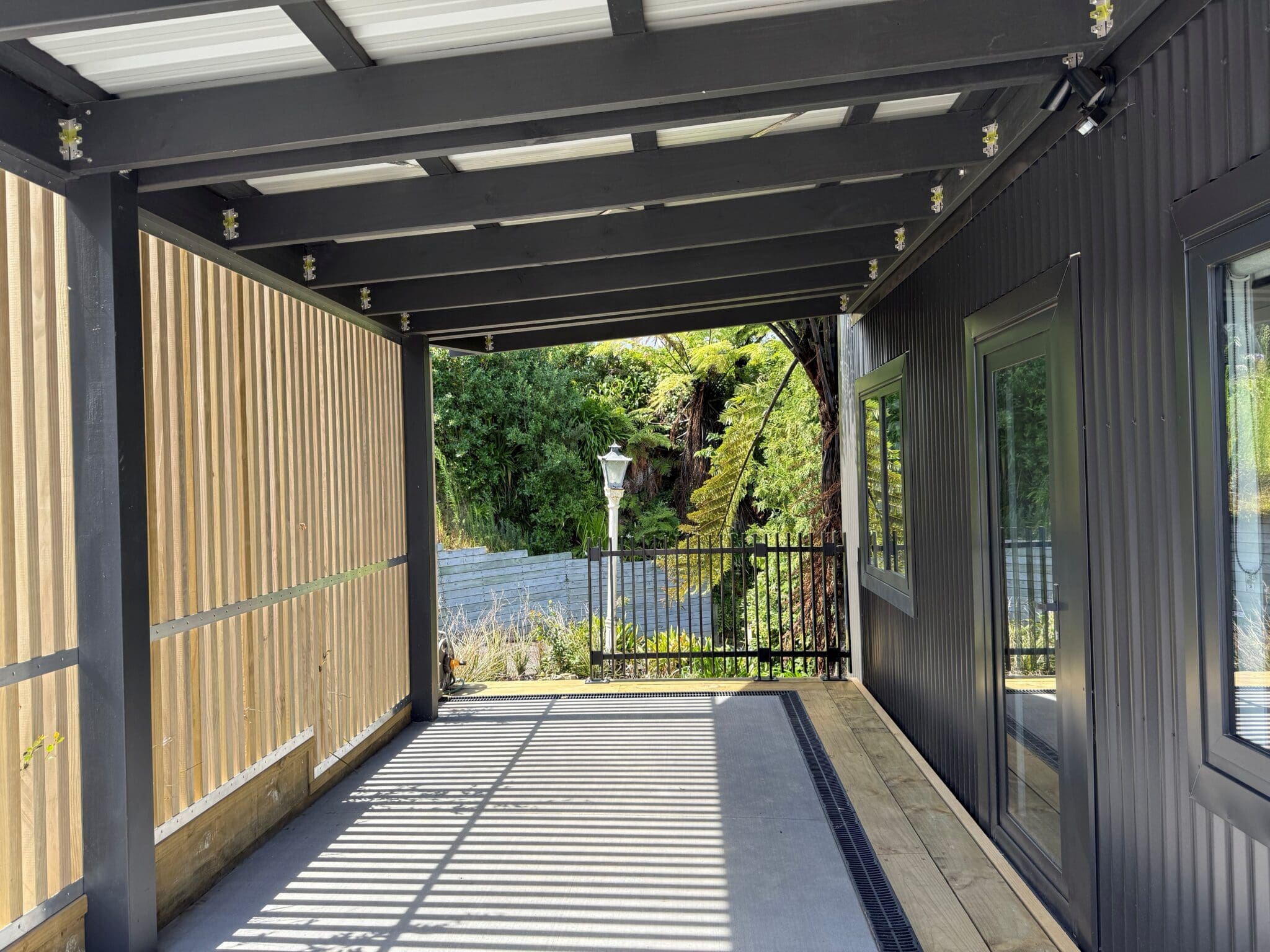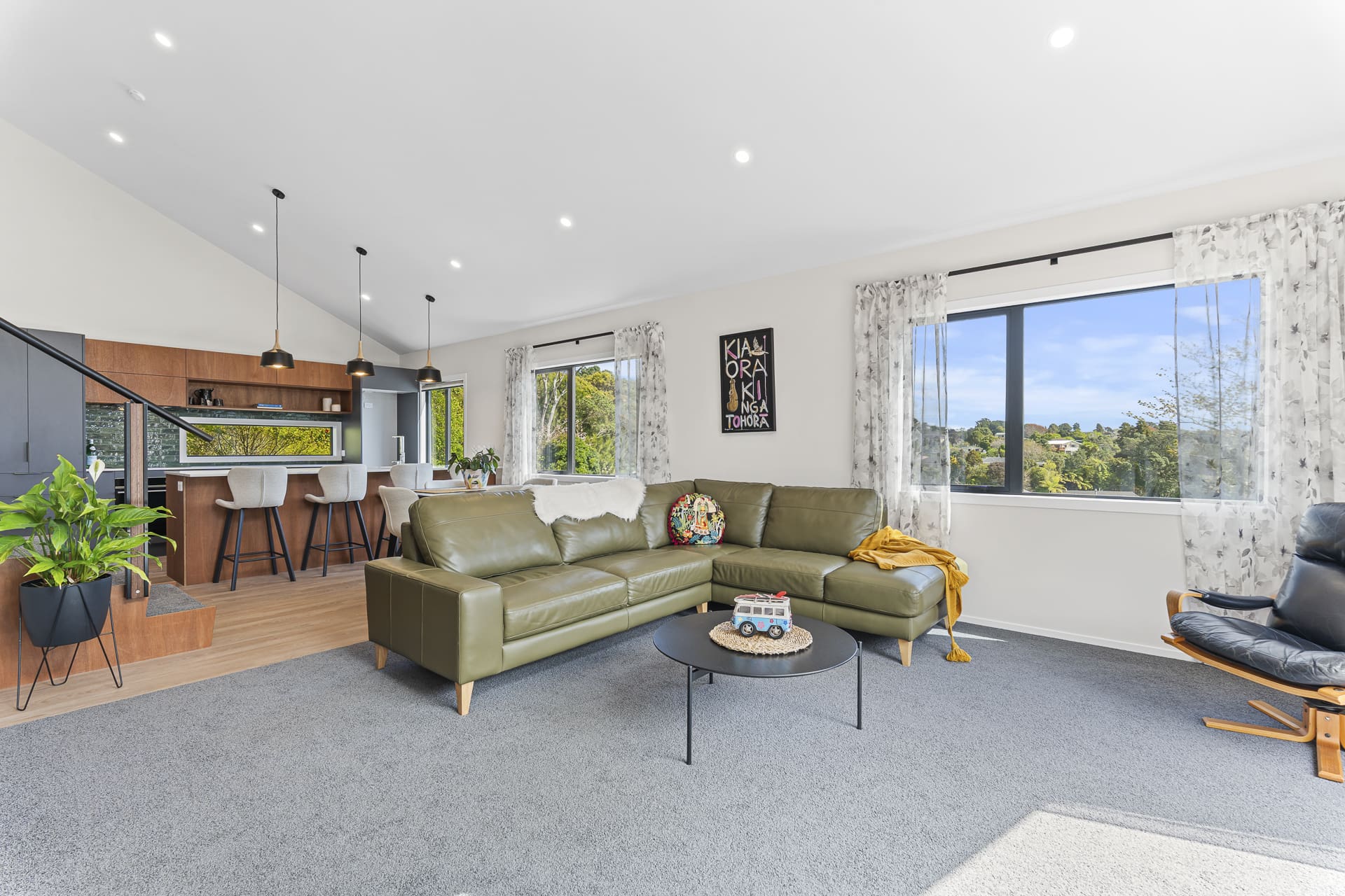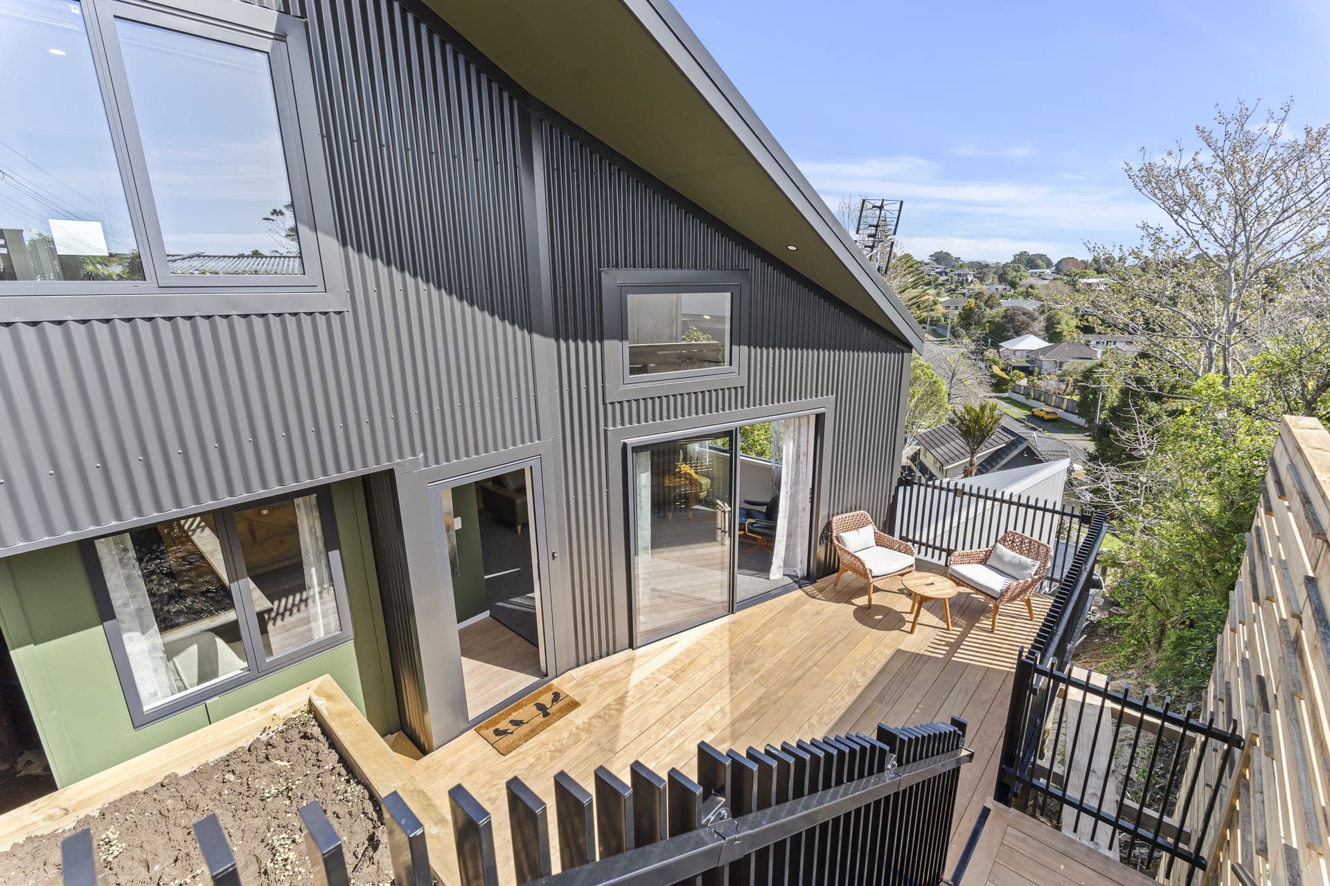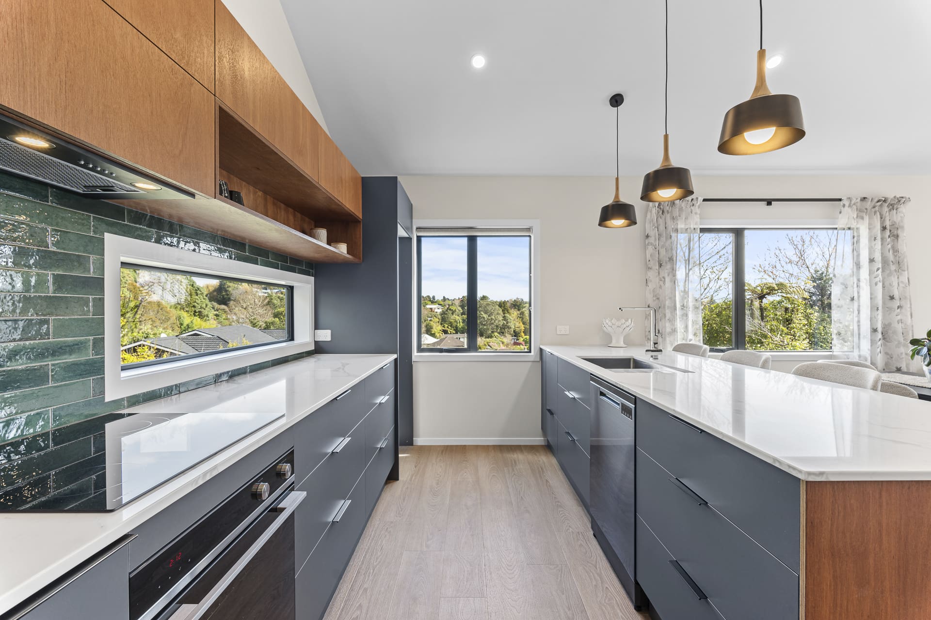 Clad in striking corrugated colorsteel, the exterior hints at the thoughtful design within. Step inside to soaring stud heights, beautiful timber features, and an airy, open-plan layout. The designer kitchen is a standout – featuring engineered stone benchtops and premium appliances, ideal for entertainers and everyday living alike.