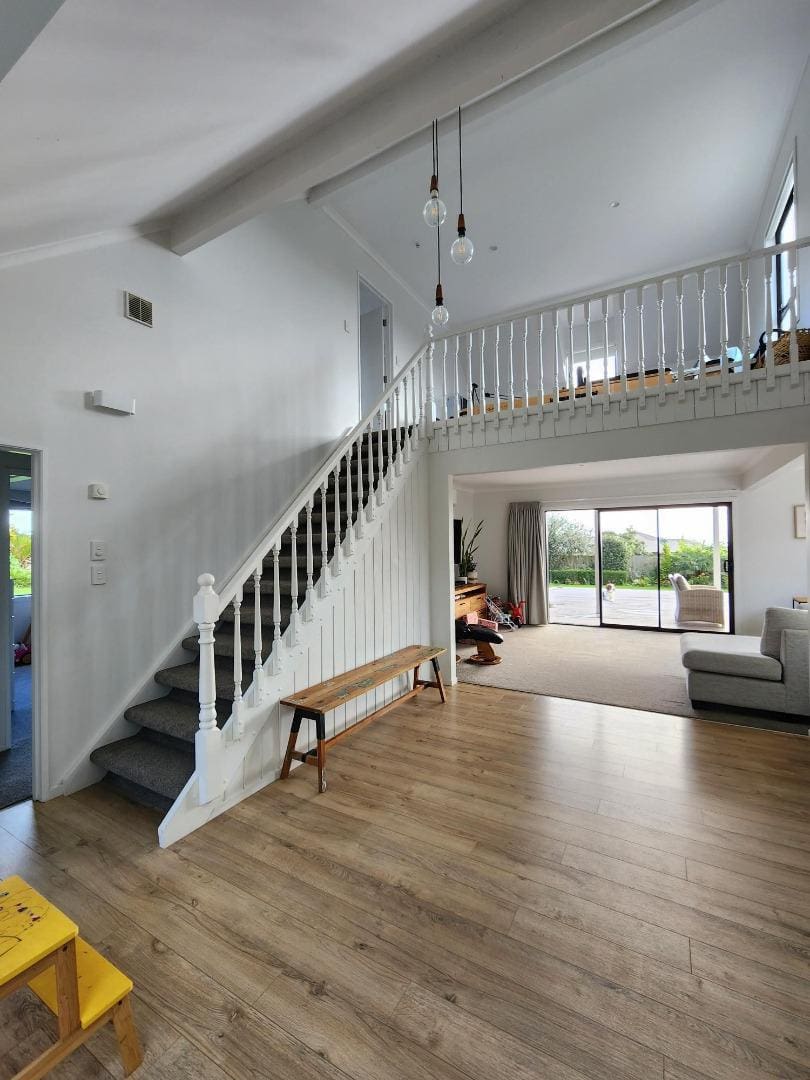 The property’s location offers distant sea views, with a backdrop of the Kaitake Ranges enhancing the tranquil and serene atmosphere. Being just minutes from a popular surf beach, local amenities enhance the property’s appeal for families seeking both comfort and convenience.