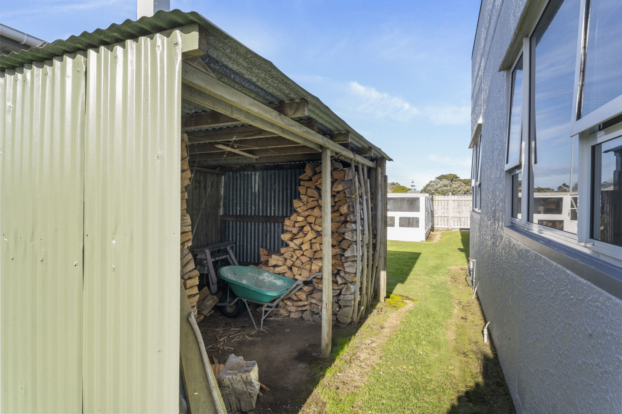 An easily accessible double garage complete with an automatic door opener. Plenty of storage for vehicles, surfboards, fishing gear and much more. If that’s not enough, the shipping container has been converted into excess storage for the lawnmower and tools.