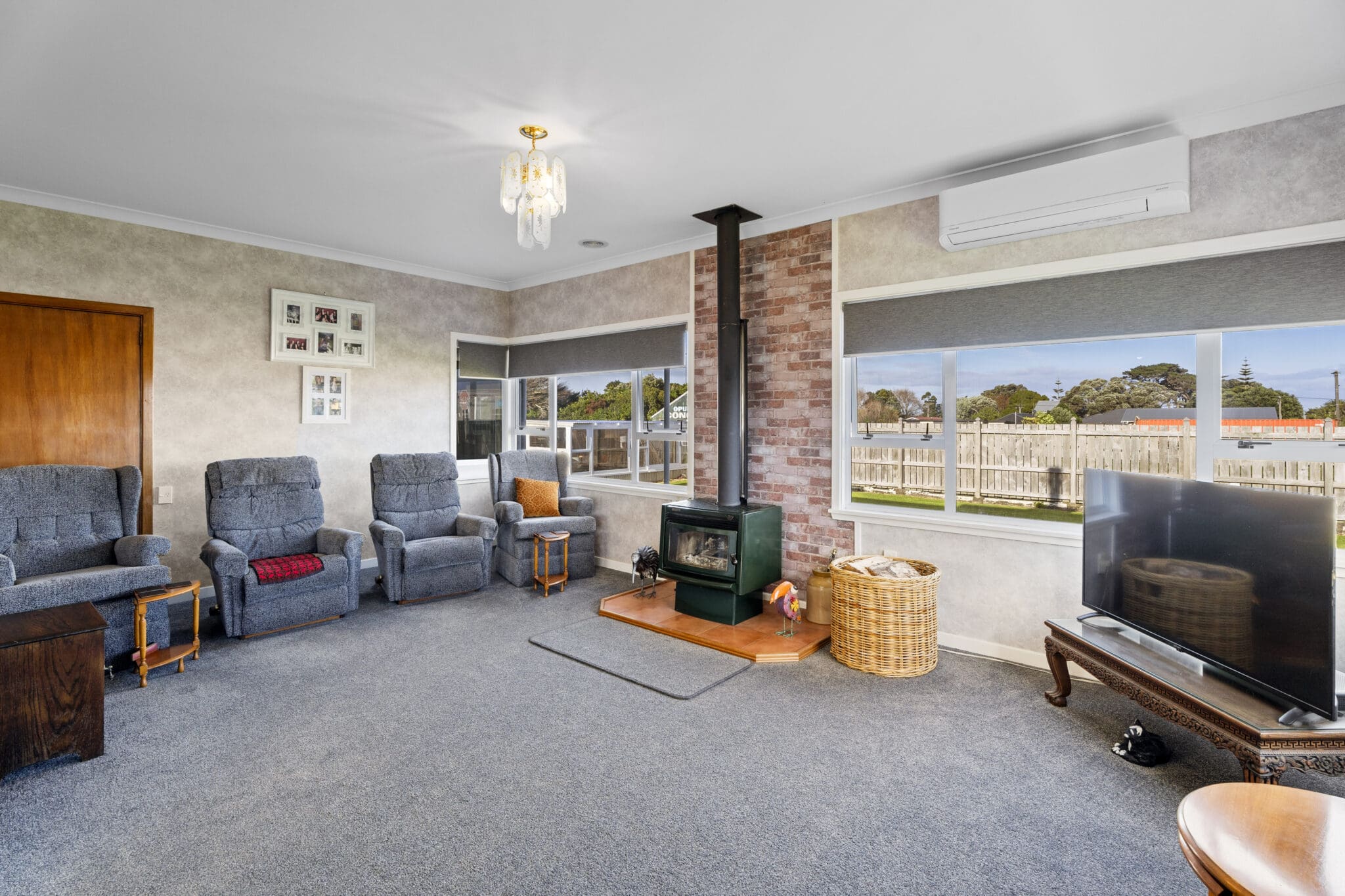 Recently painted exterior, aluminium joinery with partial double glazing, a tidy kitchen and bathroom. Two large bedrooms with beautiful built in furniture and very generous living spaces. The kitchen flows into the dining and living areas featuring a log fire and a heat pump, ensuring you’ll stay warm this winter.