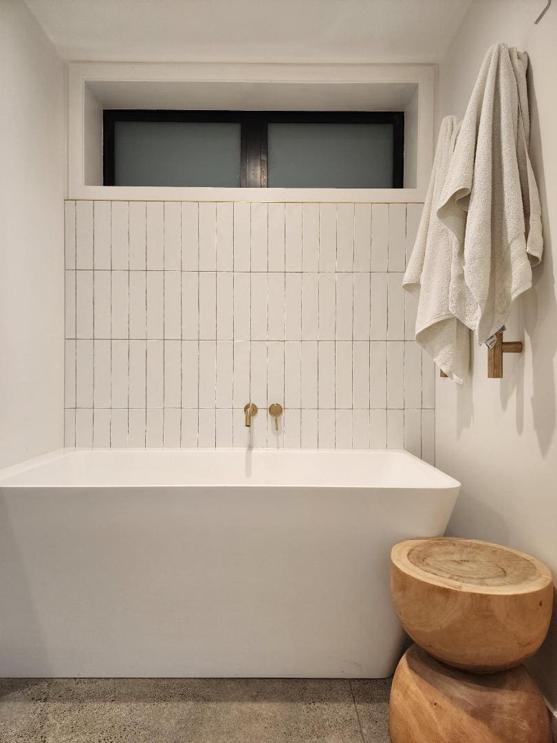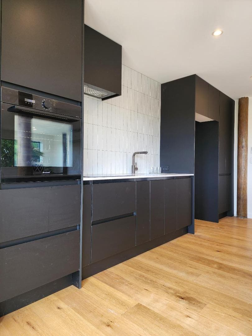 -Open-plan living with the new modern kitchen as the central hub, furnished with a sofa, TV, bar stools, lounge chair and wine fridge.