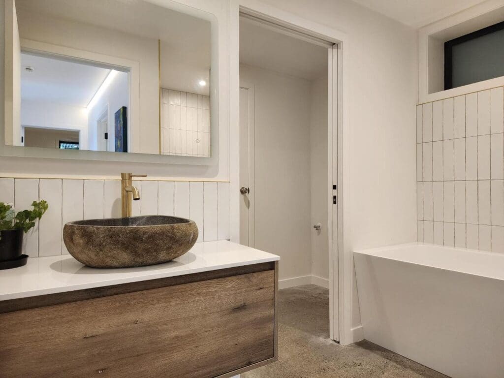 -Modern bathroom complemented with a bath and walk in tiled shower with laundry area.