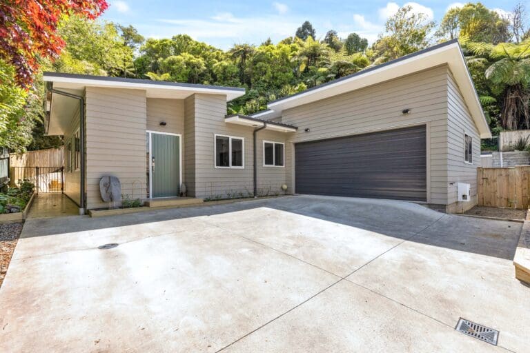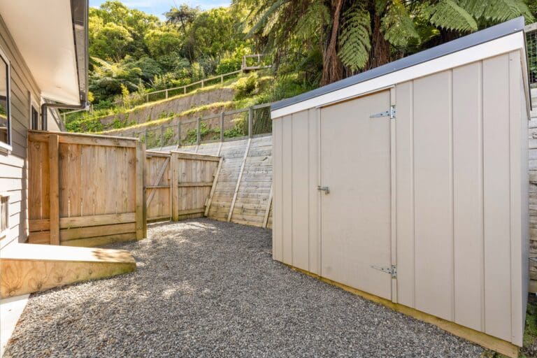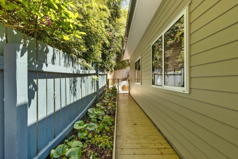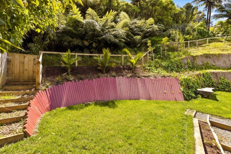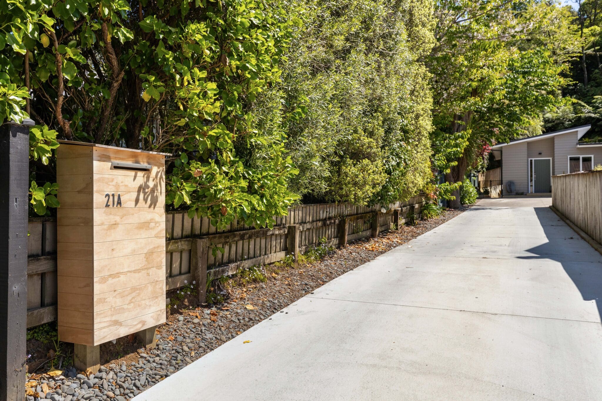 Located down a private driveway at the end of a quiet cul-de-sac, this landscaped, fully fenced section is framed by a natural backdrop of lush greenery, enhancing both the property’s privacy and appeal.