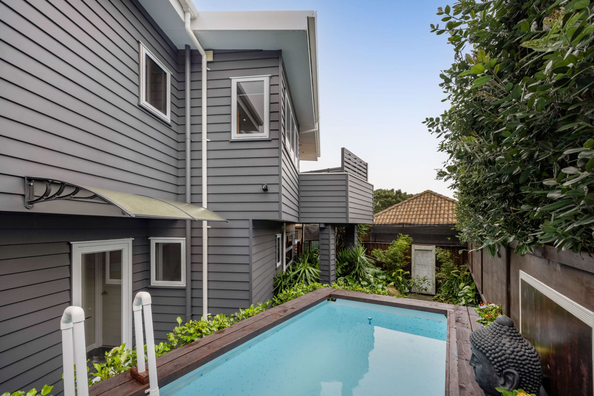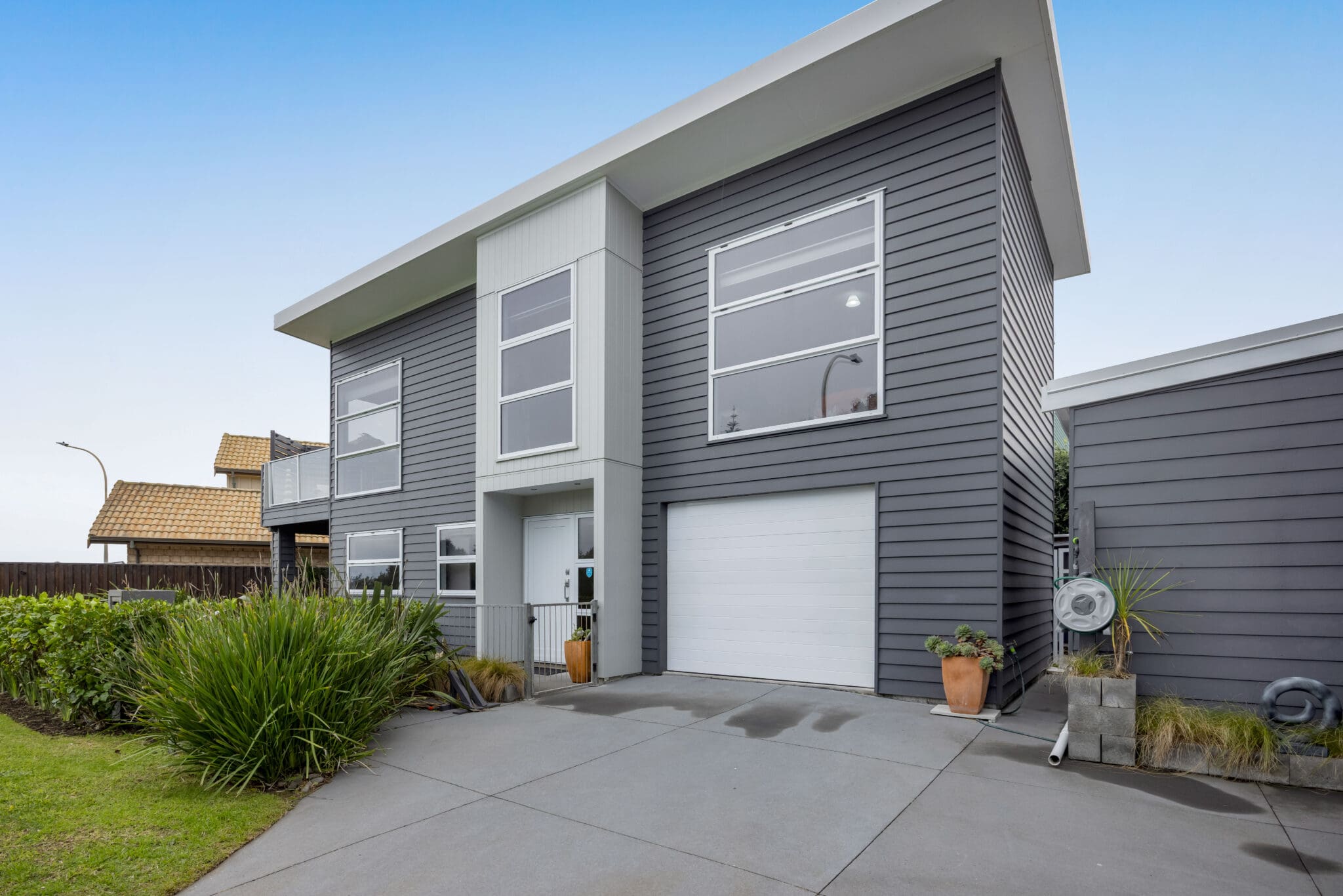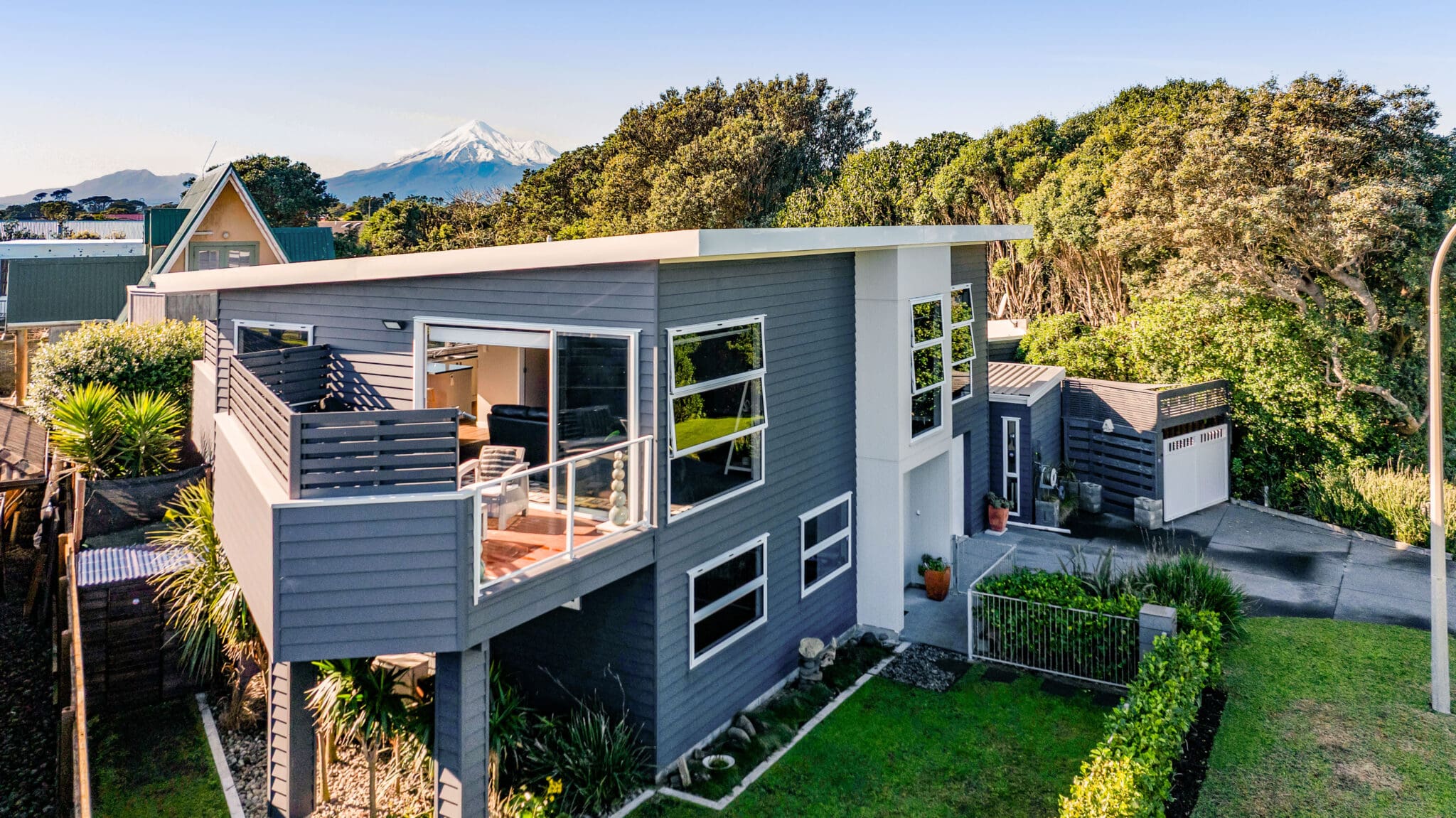 Upstairs is a private oasis featuring spacious living areas filled with natural light, a modern kitchen with gorgeous views of Mt Taranaki, and two decks with clever privacy screens. Watch the boats coming in and out of Middleton Bay right from your living room. The generous master bedroom features a walk-in wardrobe and ensuite. This property is everything coastal – aluminium mono pitch roof (including the garage), multiple decks, tropical gardens, an outdoor shower and a swimming pool.