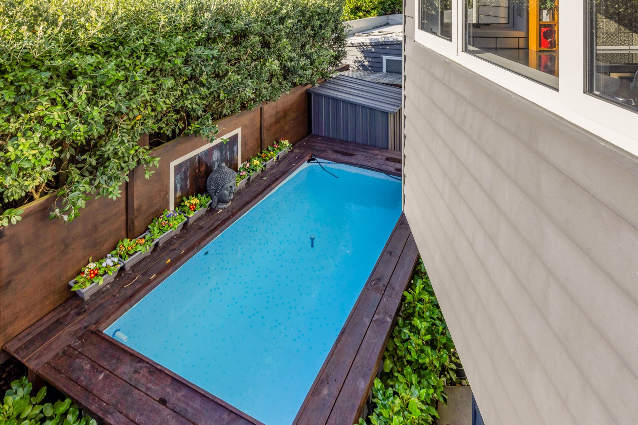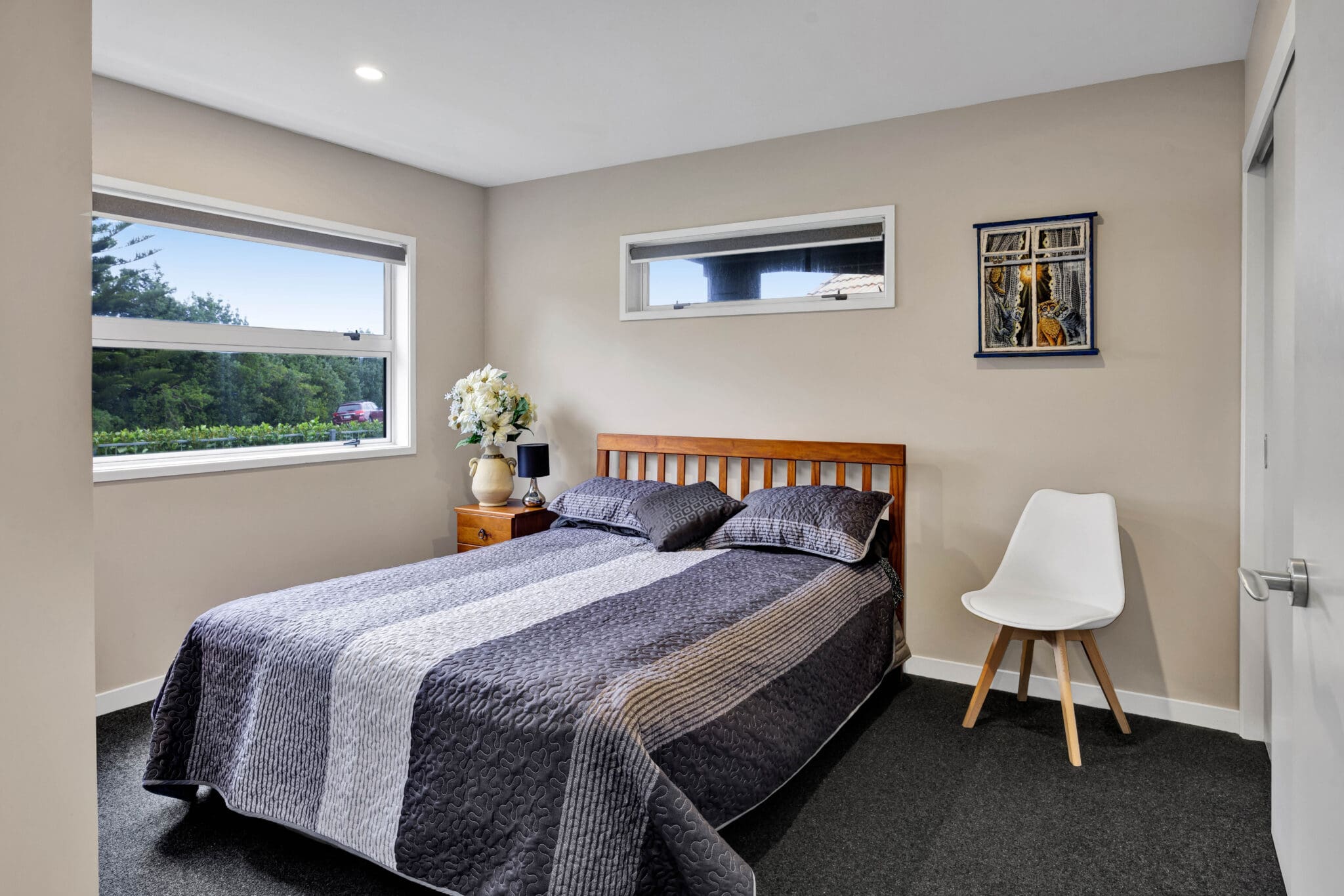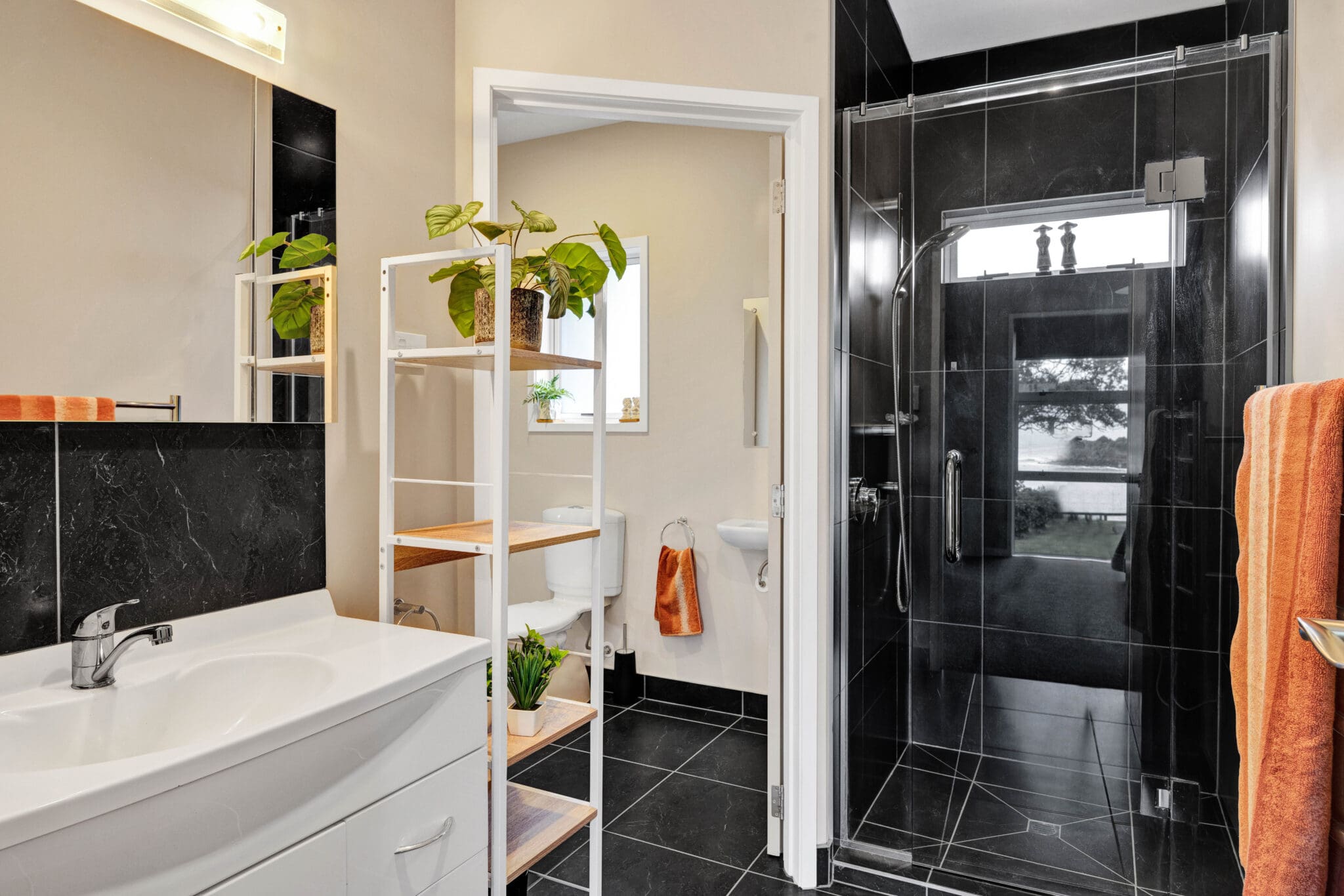 Upstairs is a private oasis featuring spacious living areas filled with natural light, a modern kitchen with gorgeous views of Mt Taranaki, and two decks with clever privacy screens. Watch the boats coming in and out of Middleton Bay right from your living room. The generous master bedroom features a walk-in wardrobe and ensuite. This property is everything coastal – aluminium mono pitch roof (including the garage), multiple decks, tropical gardens, an outdoor shower and a swimming pool.