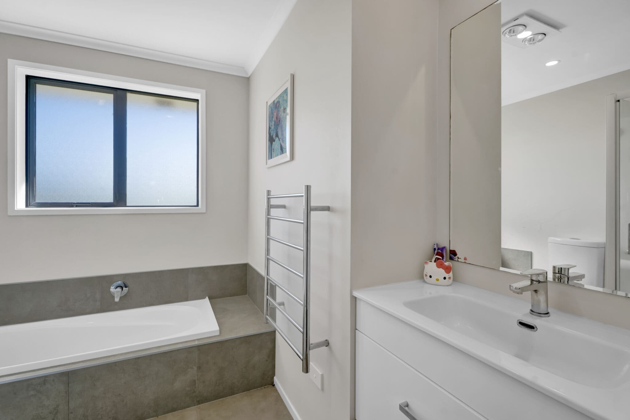 The main bathroom is fresh and well-appointed, complementing the home’s overall sense of style while keeping everyday functionality front of mind.