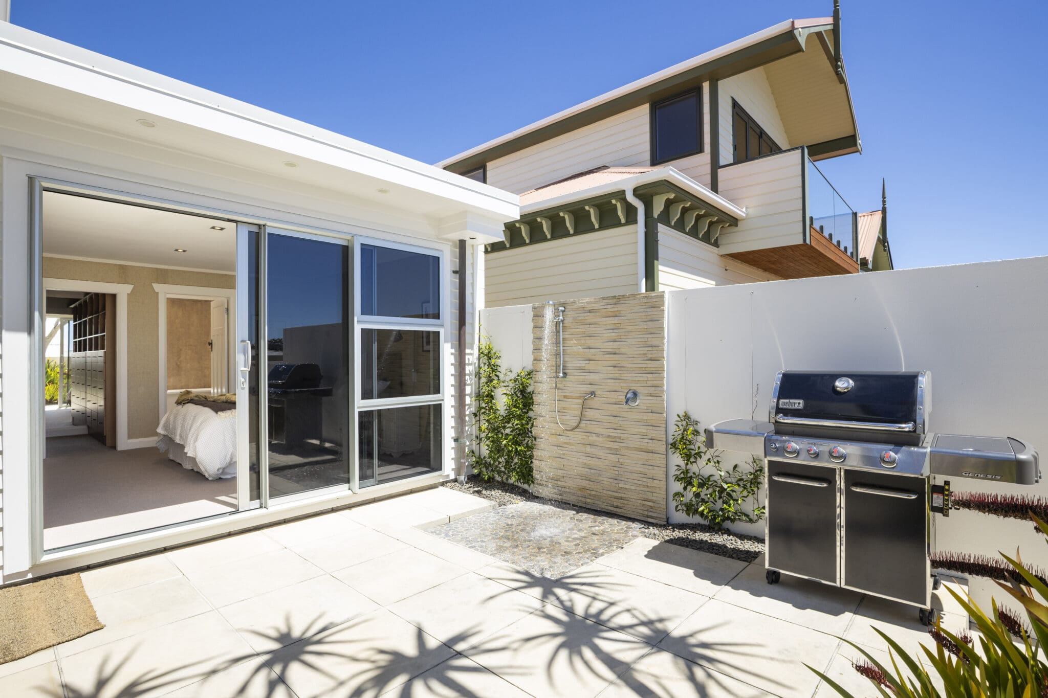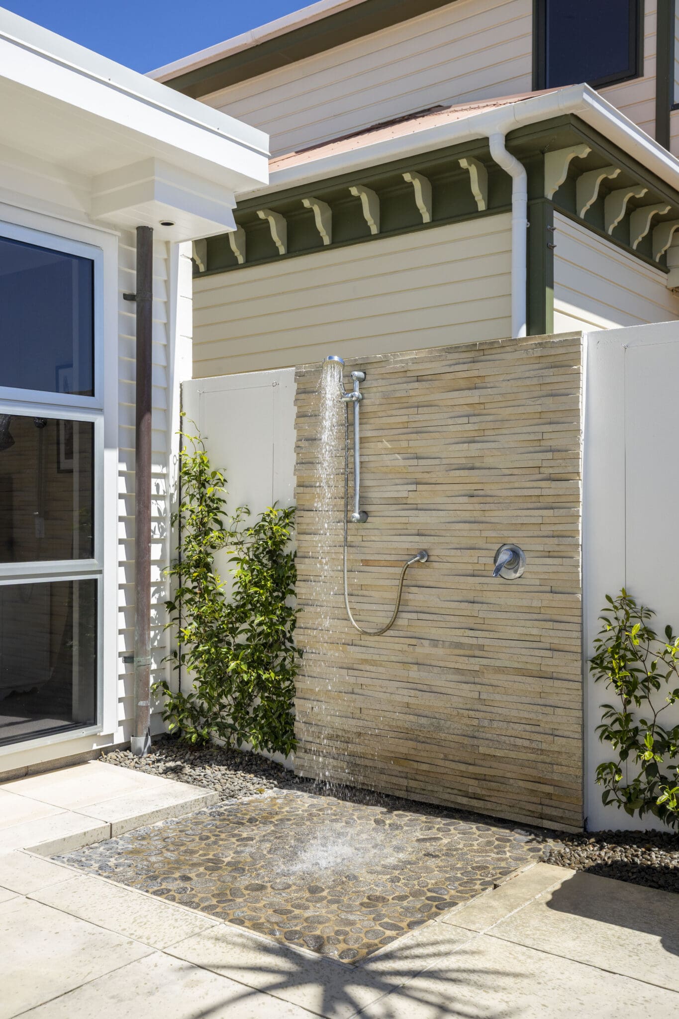 After returning from the beach or taking a swim in the heated saltwater pool, rinse off in the heated outdoor shower. Landscaped gardens and soft outdoor lighting, create a serene backdrop for morning coffee, summer afternoons, and evening gatherings under the stars.