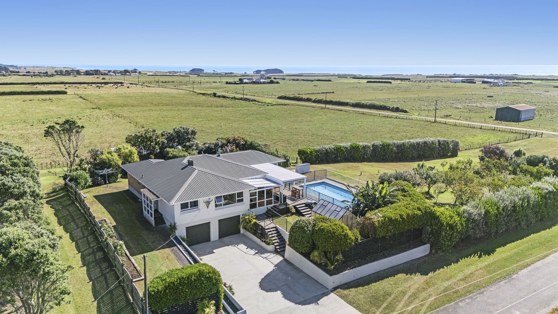 Elevated to capture breathtaking views, the property overlooks sweeping rural landscapes stretching out to the sea and mountain, offering a peaceful and private setting with all day sun. Set on just over an acre, there is potential for a second dwelling (subject to council consent).