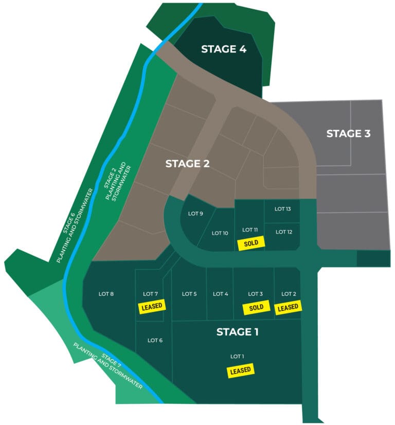 Stage one construction works have commenced which includes stage one road & underground services and all earthworks for the stage one lots. There are four completed and tenanted sites already in place, with several more underway.