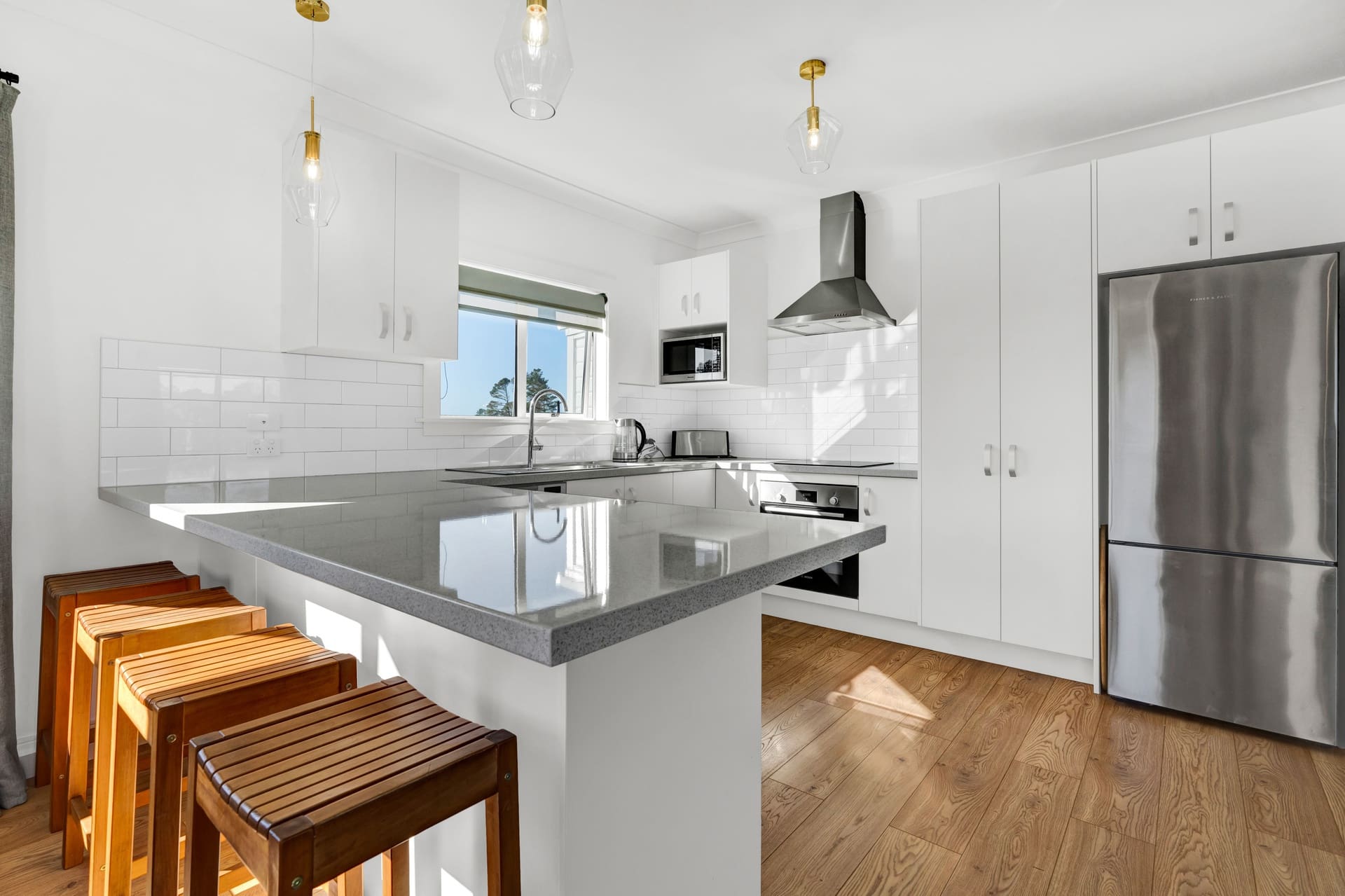 Inside, the home features a neutral palette that will appeal to many. There are three well-appointed bedrooms, a convenient bathroom with access from the hallway & master bedroom (Jack & Jill), two toilets, a separate laundry, and an open-plan kitchen, dining, and living space with stunning mountain views to the east and west.
