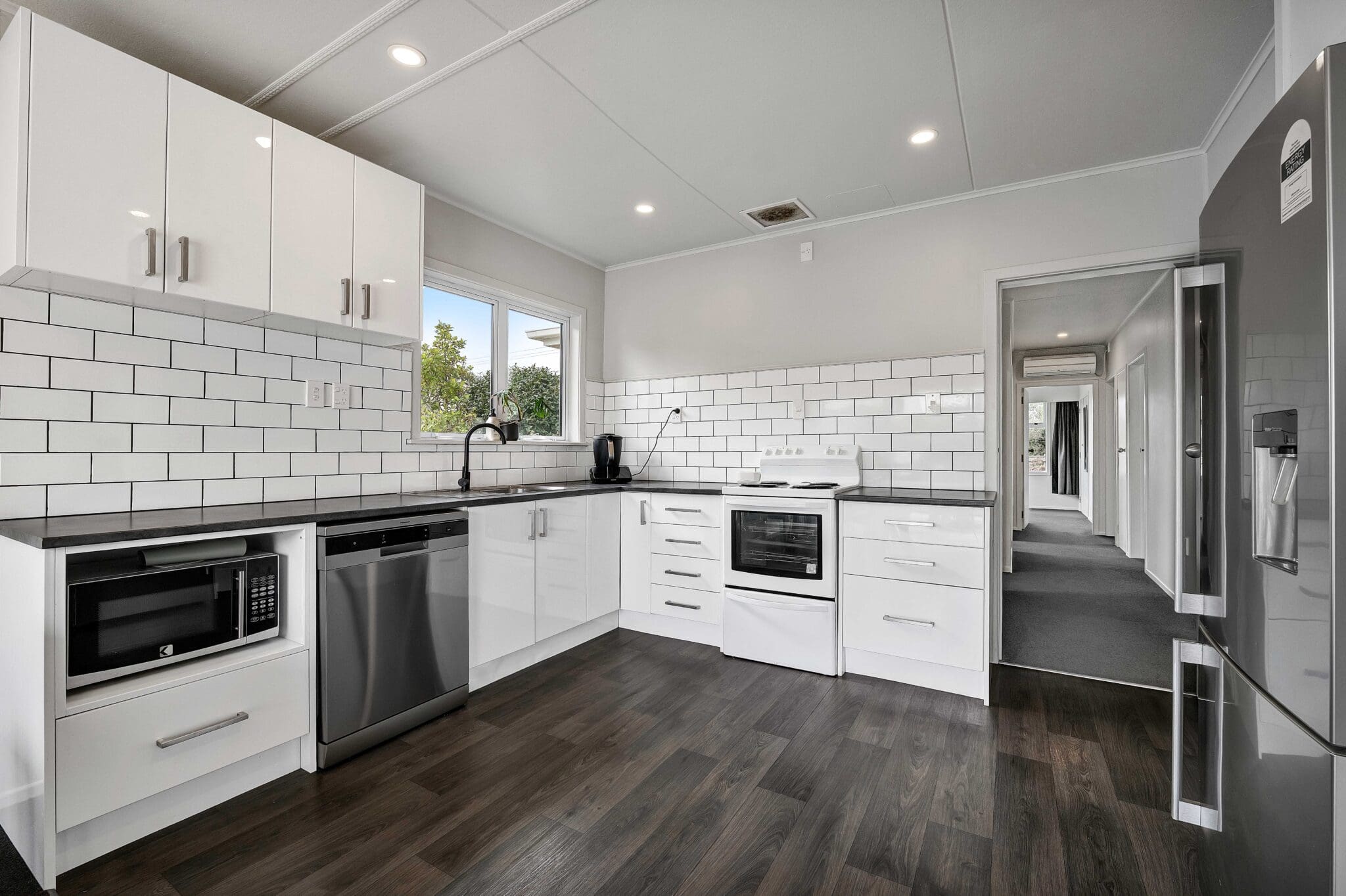 The sunny lounge invites you to relax after a busy day, with warmth provided by a log fire, and a heat pump in the hallway, along with double glazing throughout ensuring comfort year-round. The beautifully combined bathroom features both a seperate shower and a bath, for the evening soak after work. The laundry area has also been thoughtfully updated, completing this family-friendly design.
