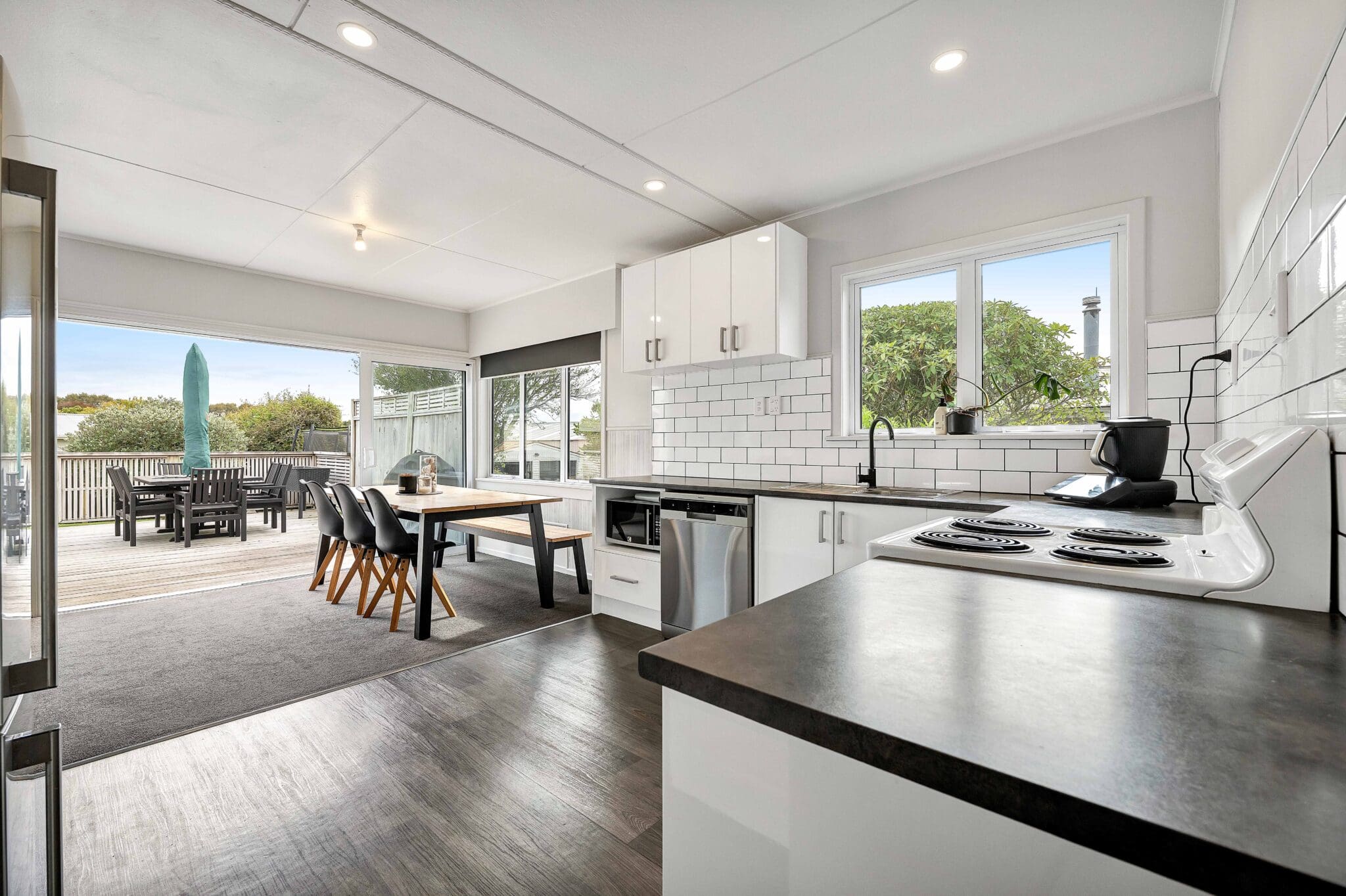 A large family home that boasts three generously sized double bedrooms, providing ample space for everyone. The heart of the home is undoubtedly the spacious open plan modern kitchen and dining area, perfect for family gatherings and entertaining friends. The updated kitchen is not only functional but stylish. The dining space opens up with stacker doors to the great deck space with mountain view.