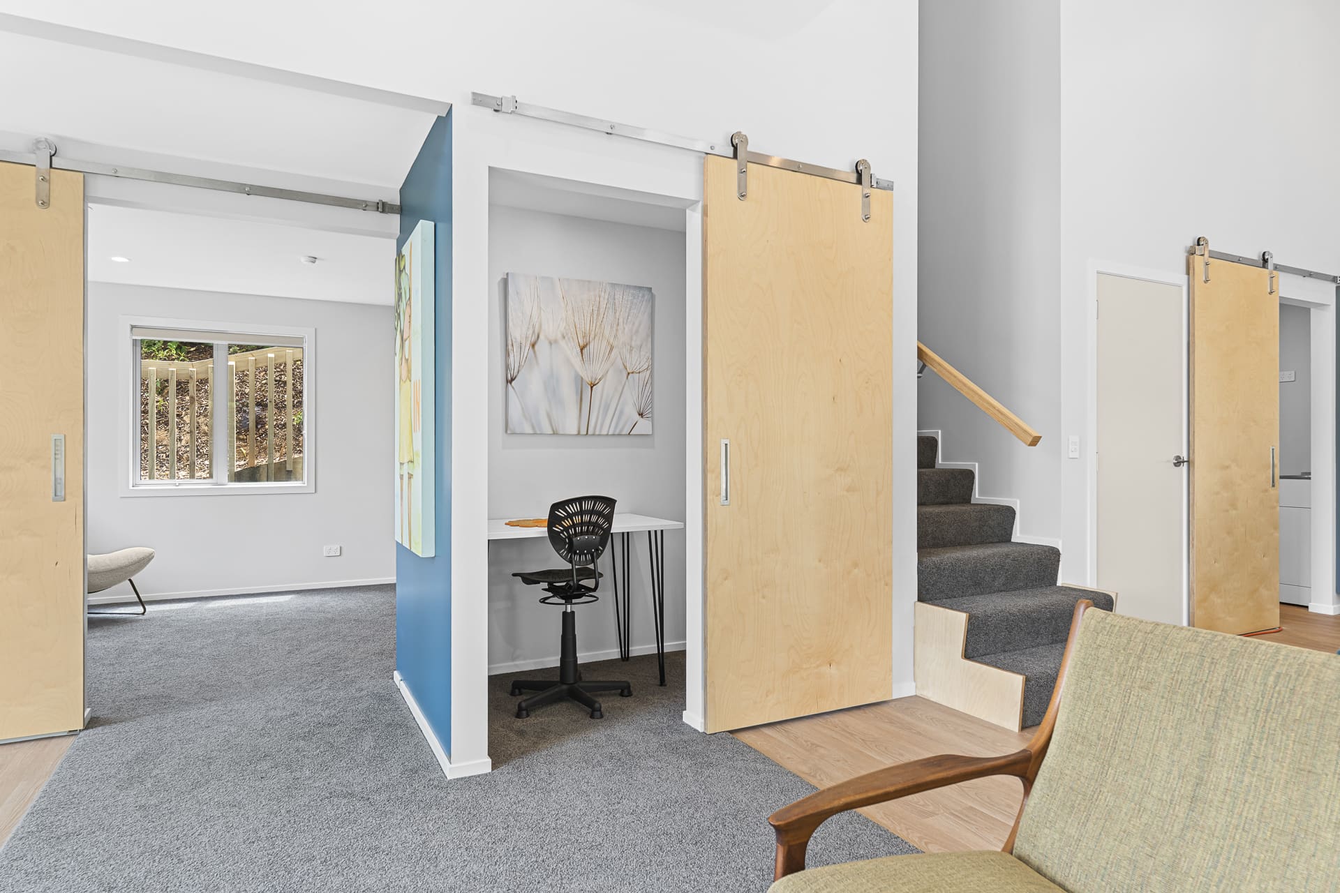 The terraced garden and wrap-around section form a tranquil oasis, providing both privacy and a beautiful connection to nature. On the ground floor, a second living space or optional third bedroom along with a handy office nook adds excellent flexibility for modern living.