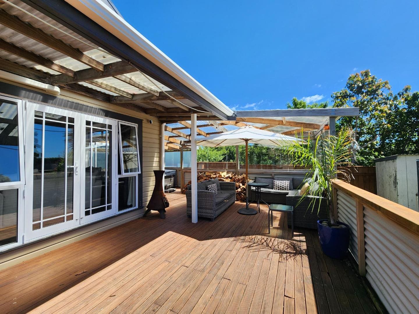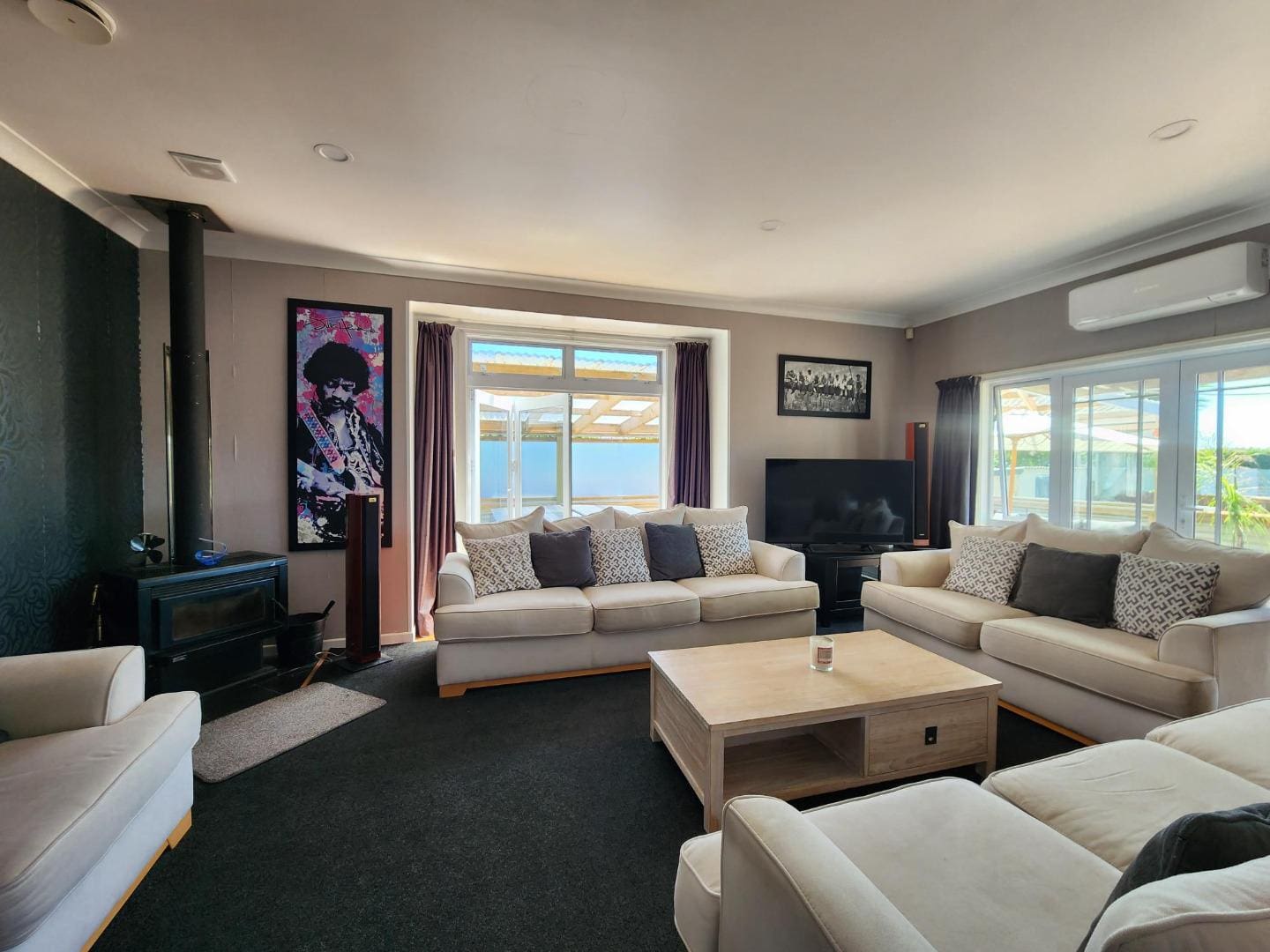 The open-plan kitchen and dining area forms the hub of the home, flowing through to a separate family lounge. Here, a cozy wood burner provides warmth during the cooler months, while large doors open seamlessly onto a spacious, sun-soaked deck–ideal for entertaining or relaxed family gatherings.