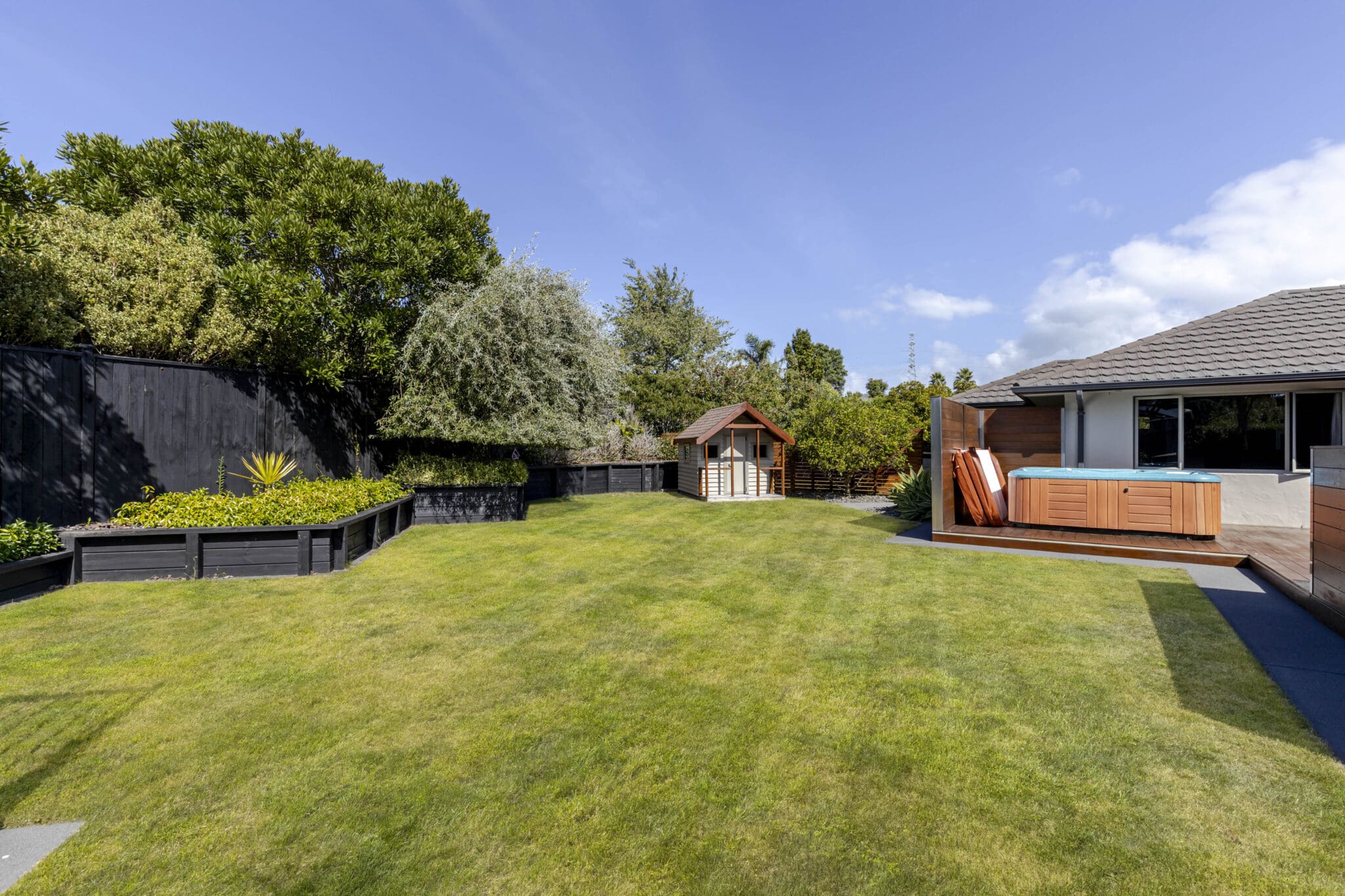 Outside, the generous flat section is a true standout. The heated pool promises endless summer enjoyment, while low-maintenance gardens mean your weekends are spent relaxing rather than weeding. A charming playhouse adds a touch of magic for younger family members, creating a backyard they’ll never want to leave.