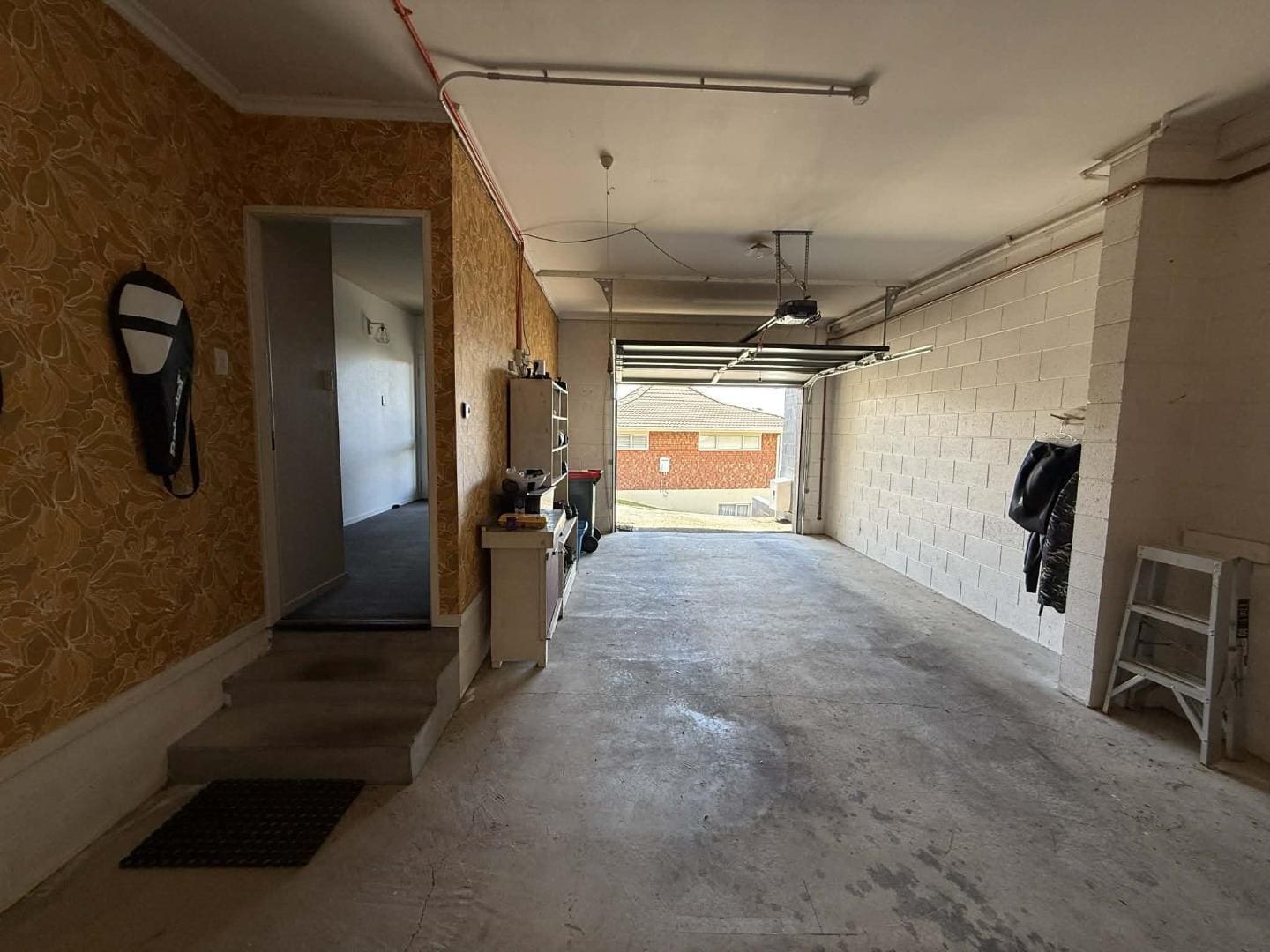 Upstairs offers two bedrooms, a bathroom, kitchen, and light-filled living areas, with a deck accessed from both the living room and one of the bedrooms. Downstairs features a third bedroom, separate toilet, laundry, and an internal-access garage with additional storage or workshop space.