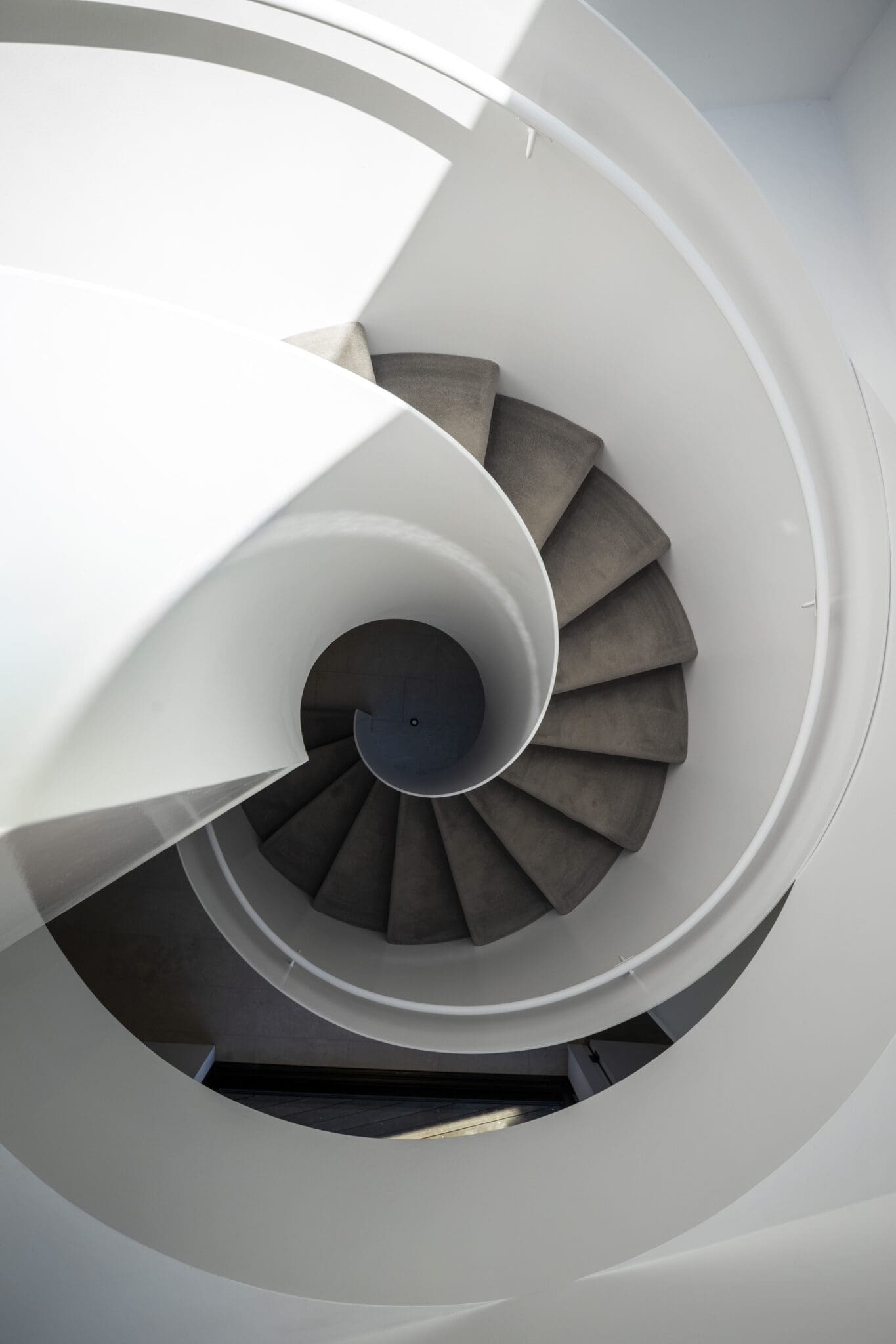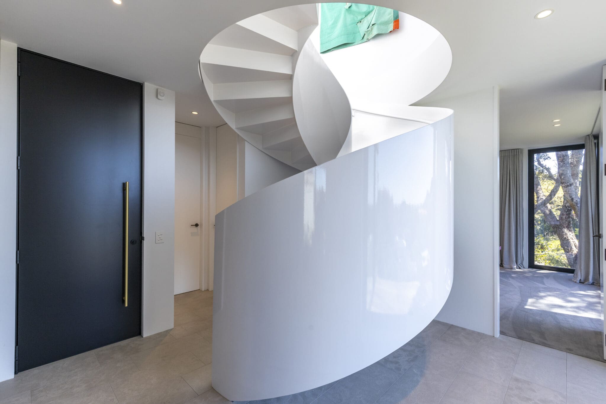 A sculptural helical staircase curves gracefully to the upper level, where four spacious bedrooms, a stunning main bathroom, and a dedicated office await. The master suite, with floor-to-ceiling windows, enjoys captivating views and offers a calm retreat.