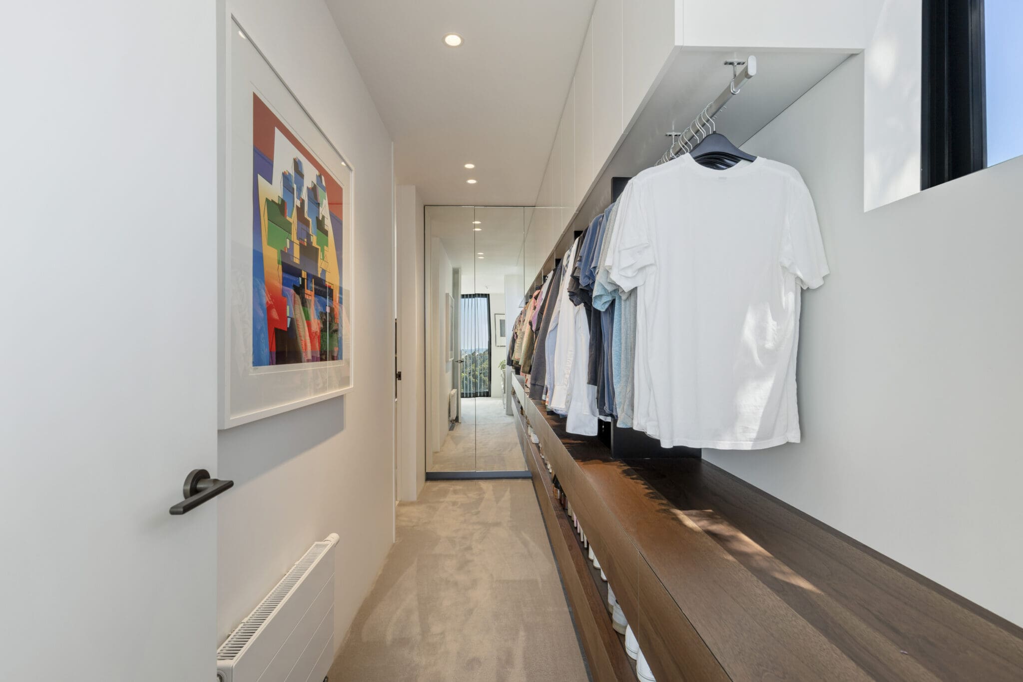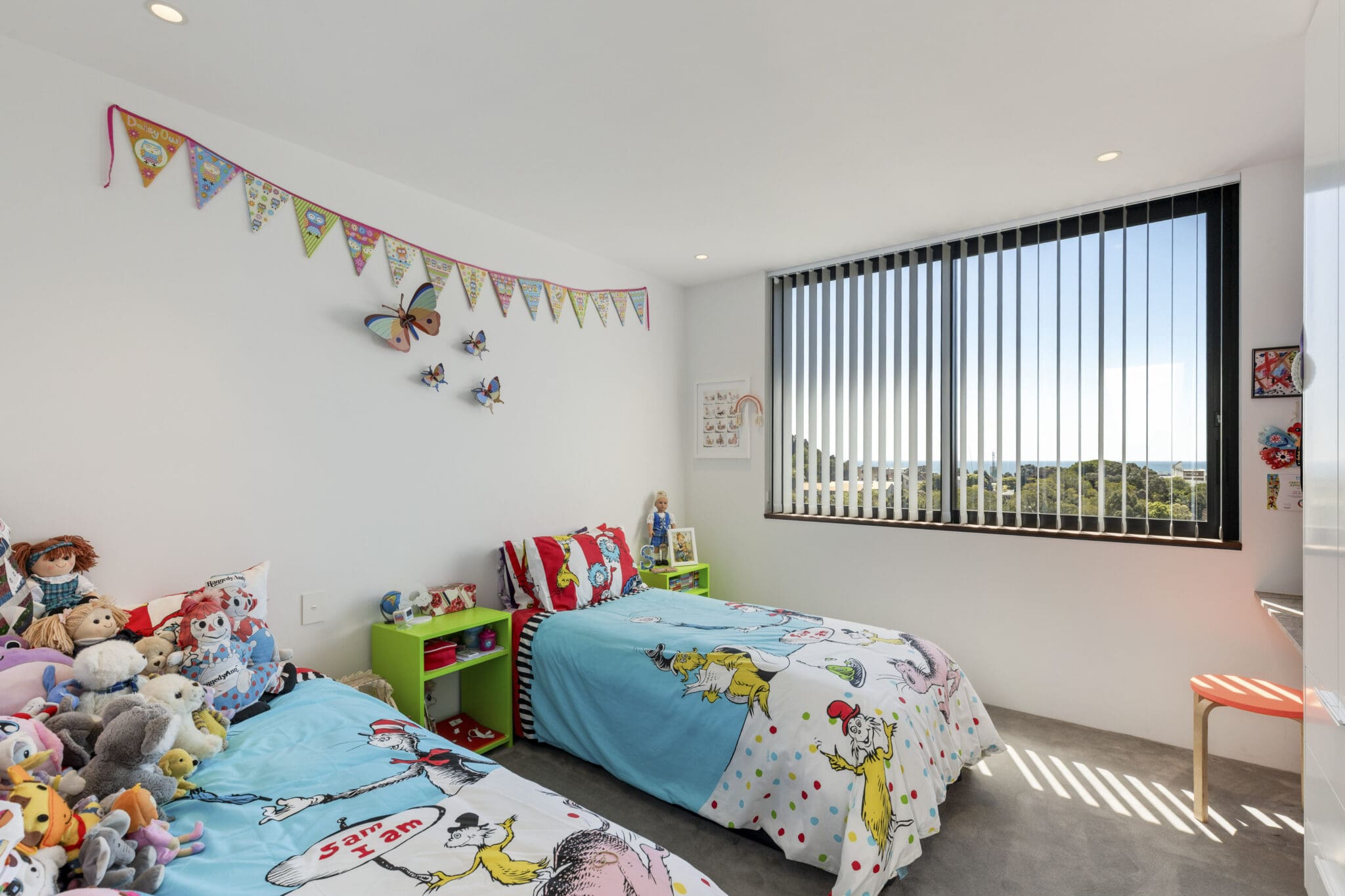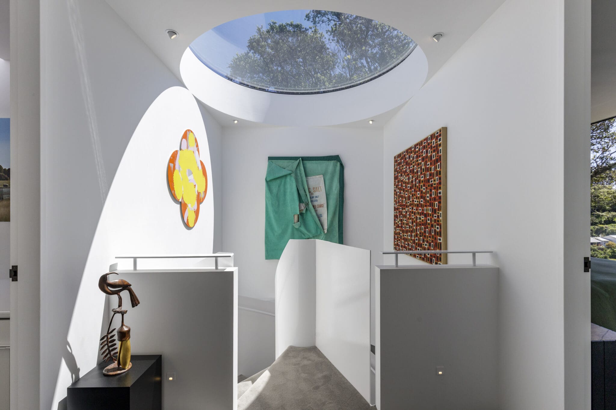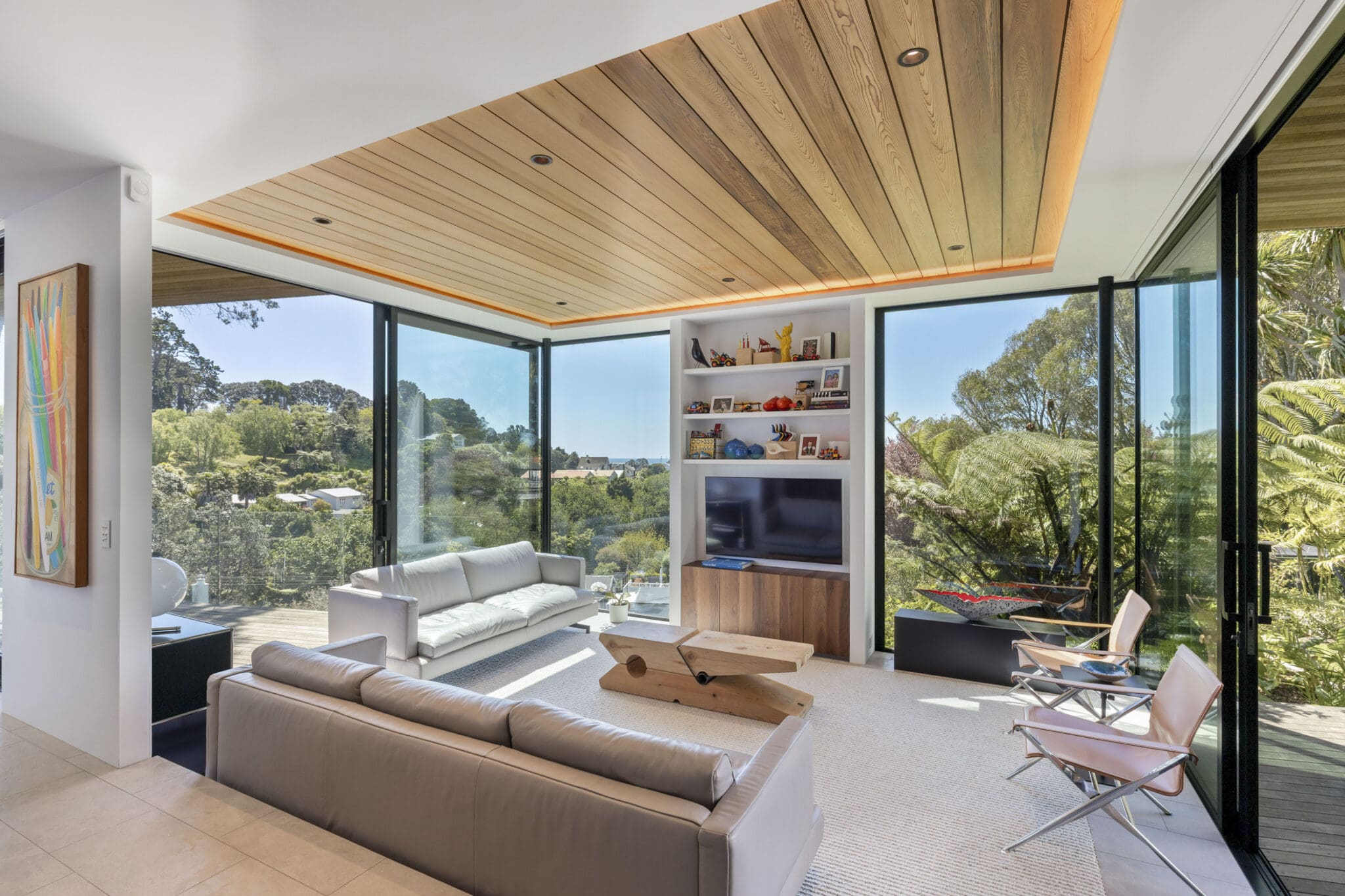 Architecturally designed, the home makes the most of its elevated position, capturing panoramic views of the city, treetops and the sea.