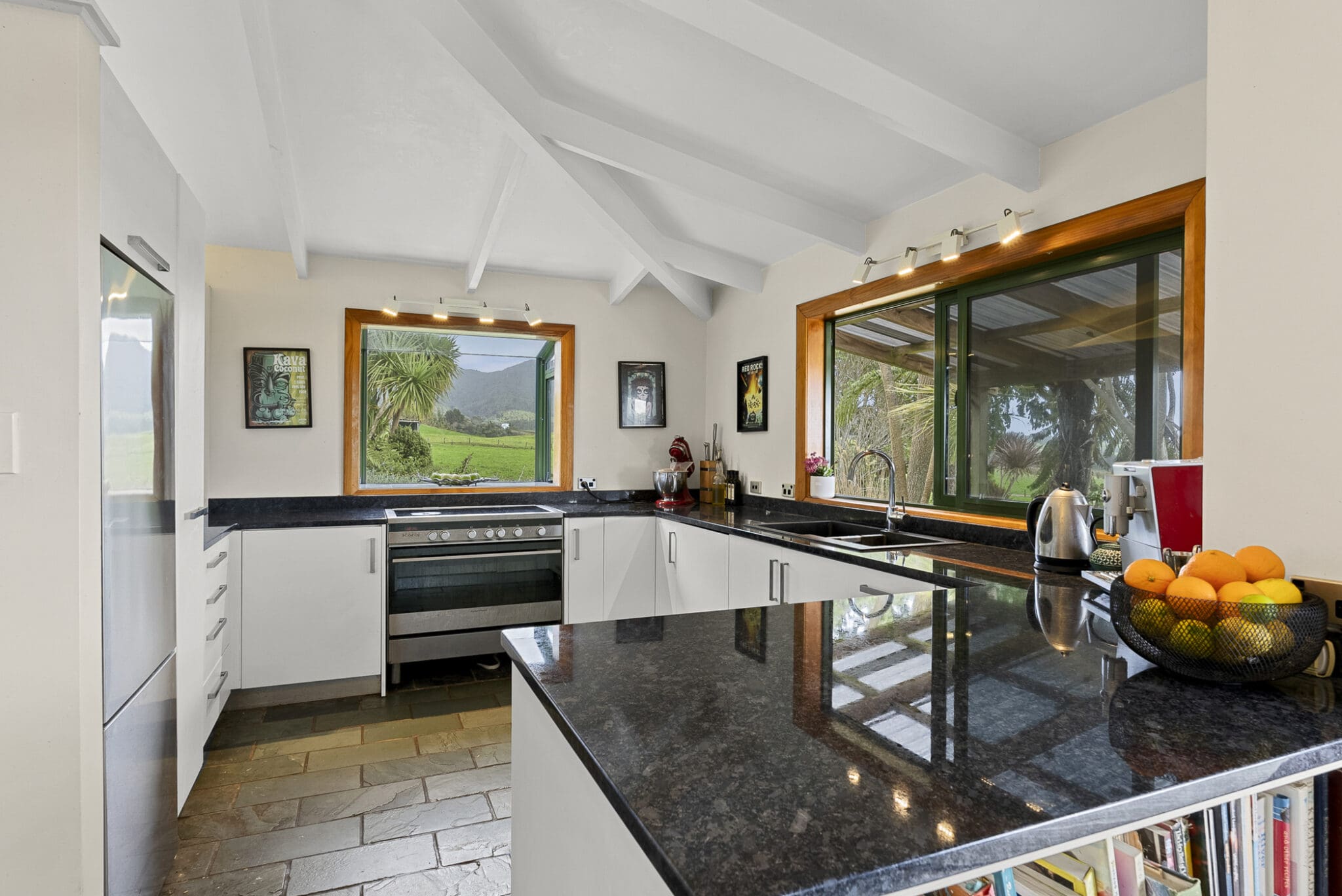 The well designed home boasts exceptional views from every window. Glorious views of Mt Taranaki Maunga, the beautiful Pouakai and Kaitake ranges and the glittering Tasman Sea. Very few places can offer such stunning uninterrupted views! The open plan kitchen and dining sprawls out to an expansive deck perfect for entertaining and catching all day sun. The central living room offers a cozy space to snuggle up by the log fire and enjoy in the winter months.