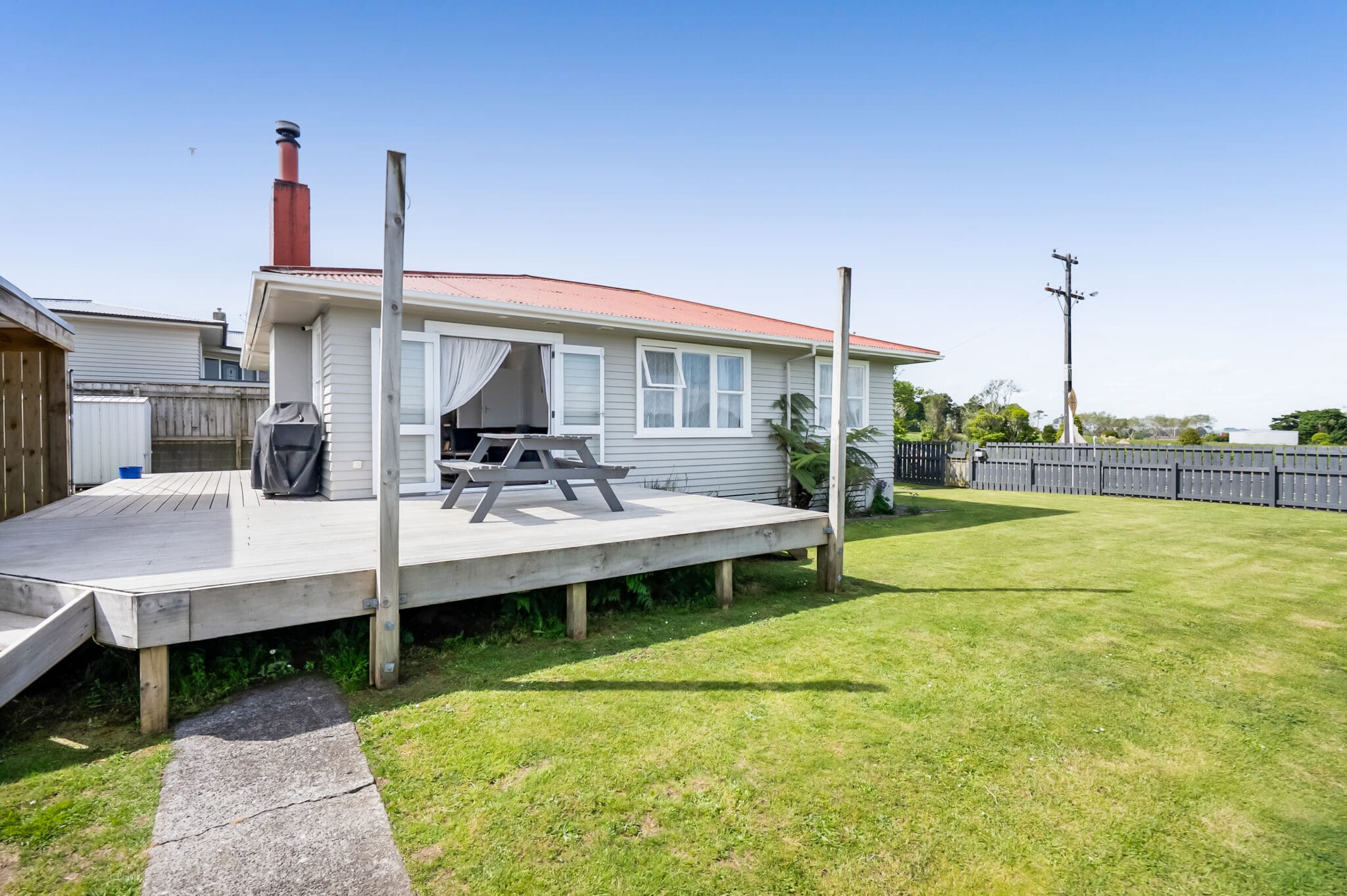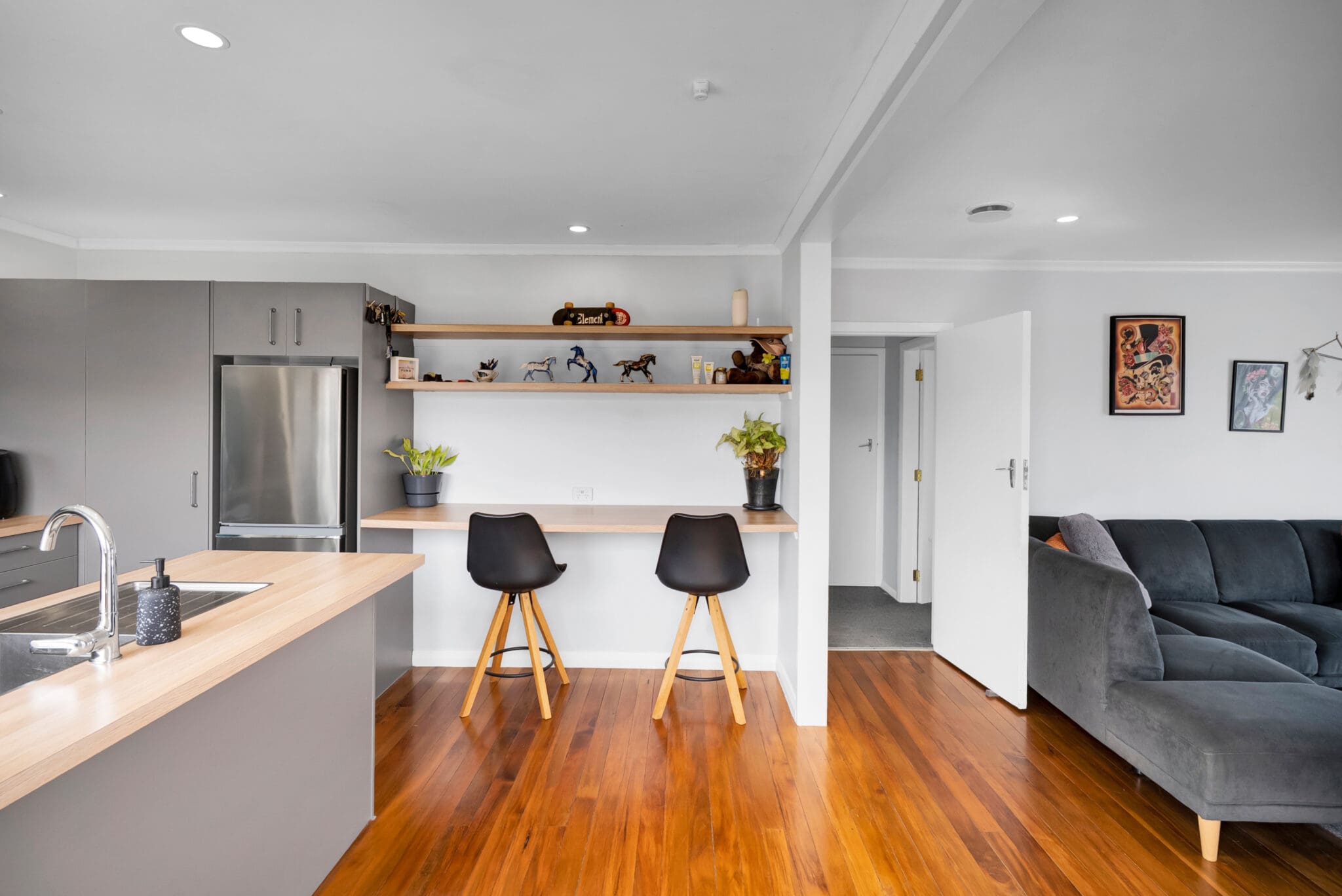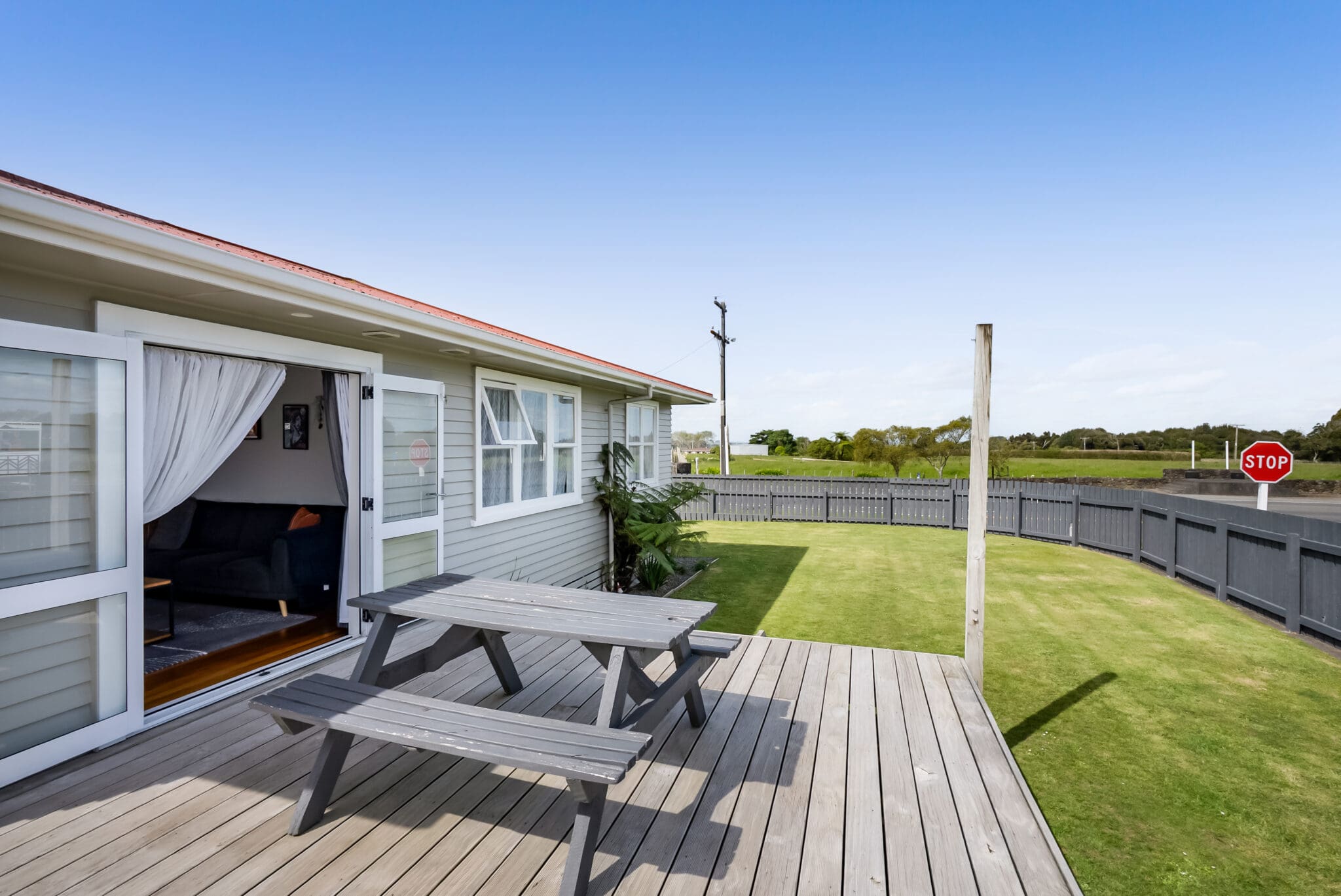 The open-plan living area is the heart of the home, featuring a stylish kitchen with a stunning view of Mount Taranaki framed through a large picture window — a beautiful backdrop for everyday living. The dining area flows into a cosy lounge warmed by a log fire, creating a welcoming space for family time and entertaining. French doors open onto the sunny deck, ideal for barbecues, relaxed evenings, and outdoor dining.