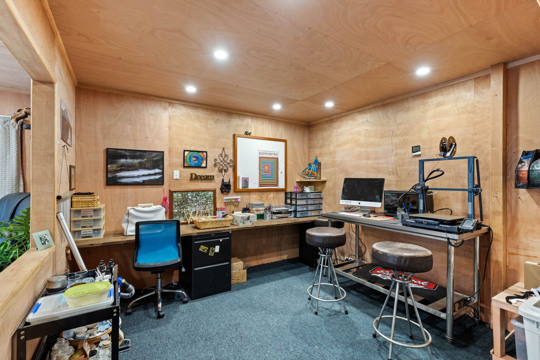 The property includes ample off-road parking, a designated area for contractor vehicles and machinery, and a small paddock perfect for livestock. Enjoy raised gardens in the sheltered area near the home, all situated on approximately 1.3 acres. Additionally, there is a separate double garage with a workshop.